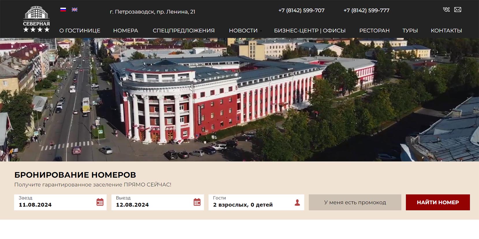 «Северная» — старейшая гостиница города, классифицированная на уровне 4*. Расположена она в историческом здании 1948 года. Номера разных категорий оснащены всем необходимым. От гостиницы недалеко до Онежского озера, национального музея, железнодорожного вокзала, театров и других туристических мест. В гостинице открыт «Северный» ресторан с собственной пивоварней. В часы работы ресторана гостям доступна доставка еды в номер.