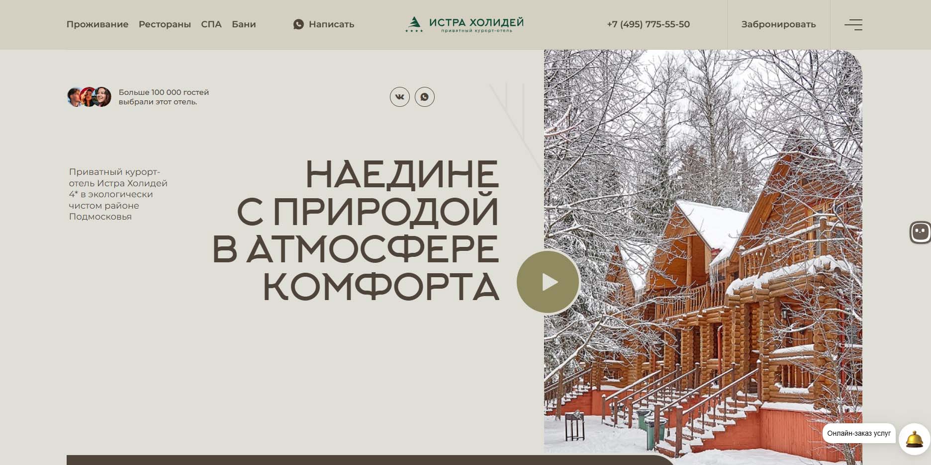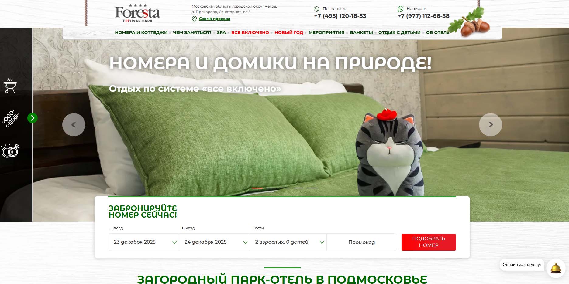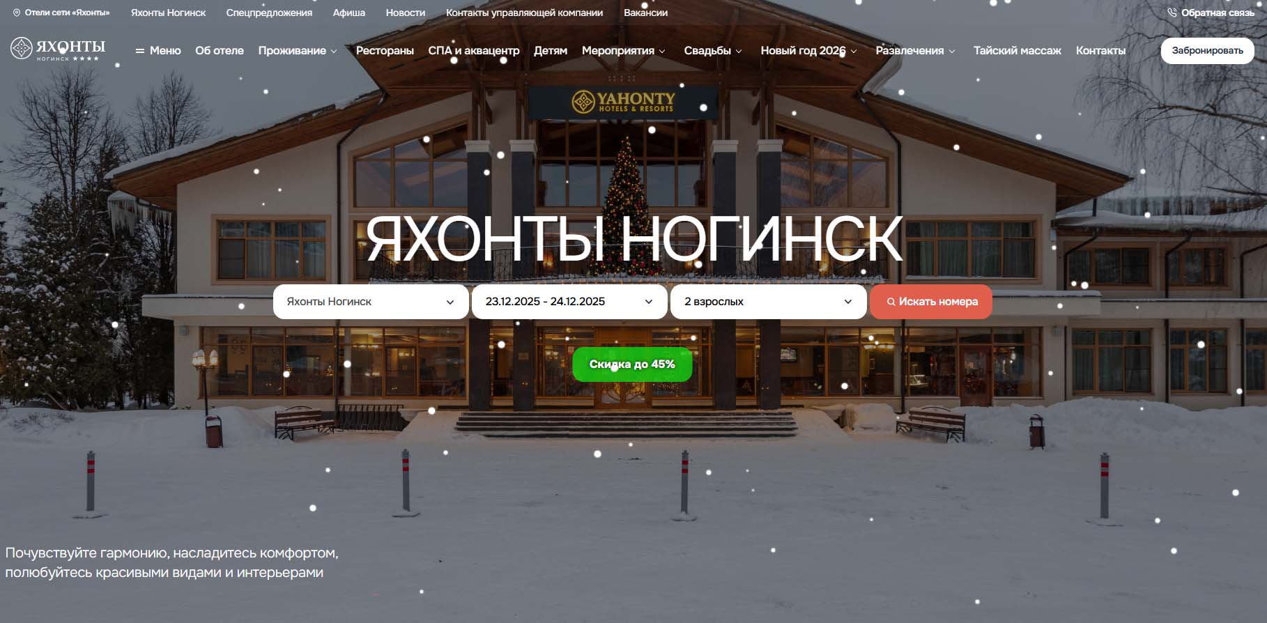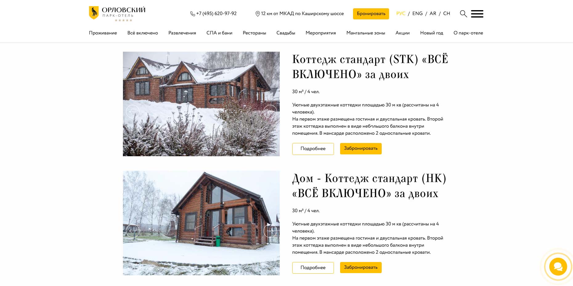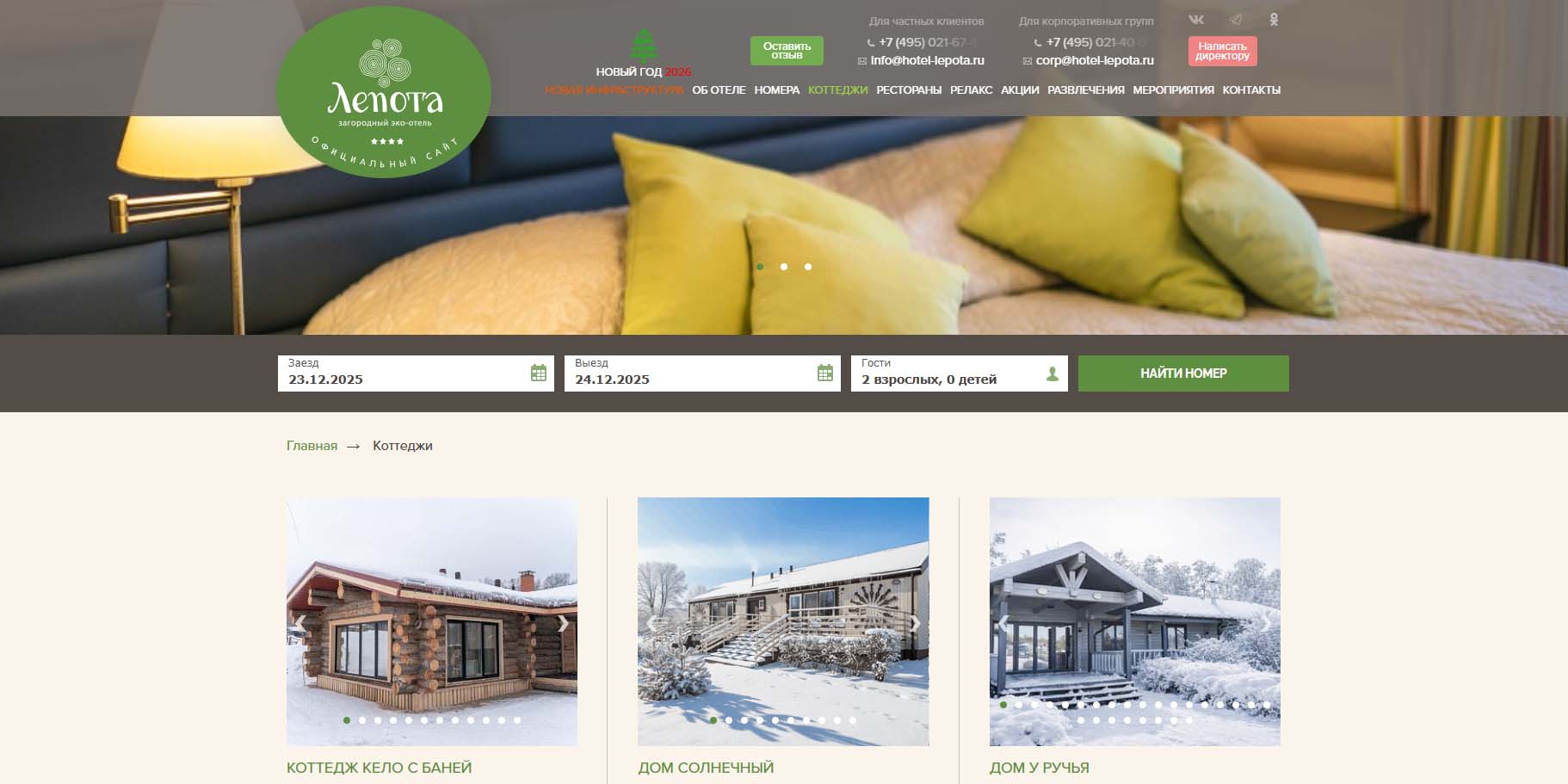На территории отельного комплекса построены несколько современных коттеджей: из древесного сруба или более современные вариации. Есть одно- и двухэтажные дома на 5–10 гостей. Ничего вычурного, все очень лаконично. На Новый год 2026–2027 обещают концерт звезды.