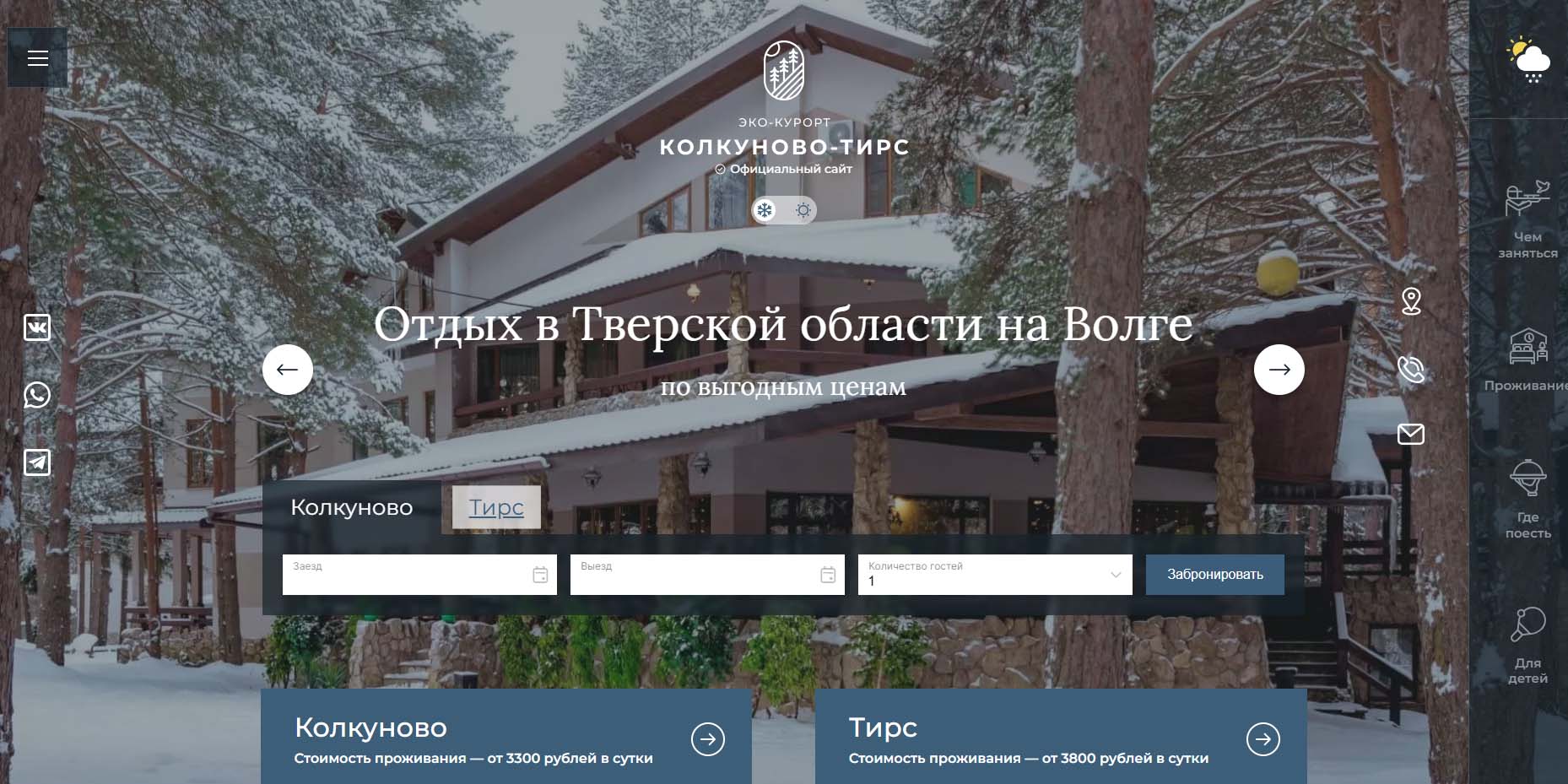 Этот поселок на границе Московской и Тверской областей. С одной стороны протекает Волга, а с другой река Колкуновка. На берегу стоят бани. Есть ресторан с караоке и бильярд. Для бронирования на праздники доступны 16 видов коттеджей: уютный вариант на двоих или особняки на компанию из шести человек.