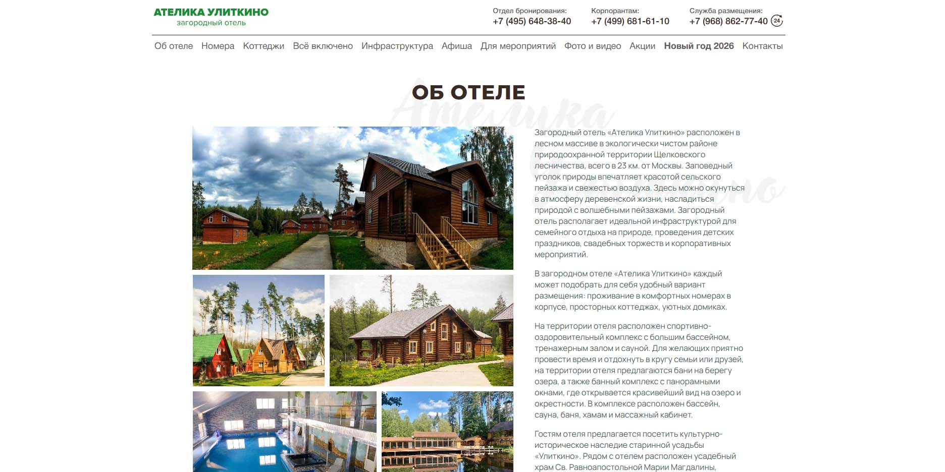 Спа-отель с боулингом и пейнтбольной площадкой. В аренду предлагают один из девяти коттеджей. На Новый год доступно только бронирование с 30 декабря по 3 января. При комплексе есть детский развивающий клуб. Все путевки с питанием.