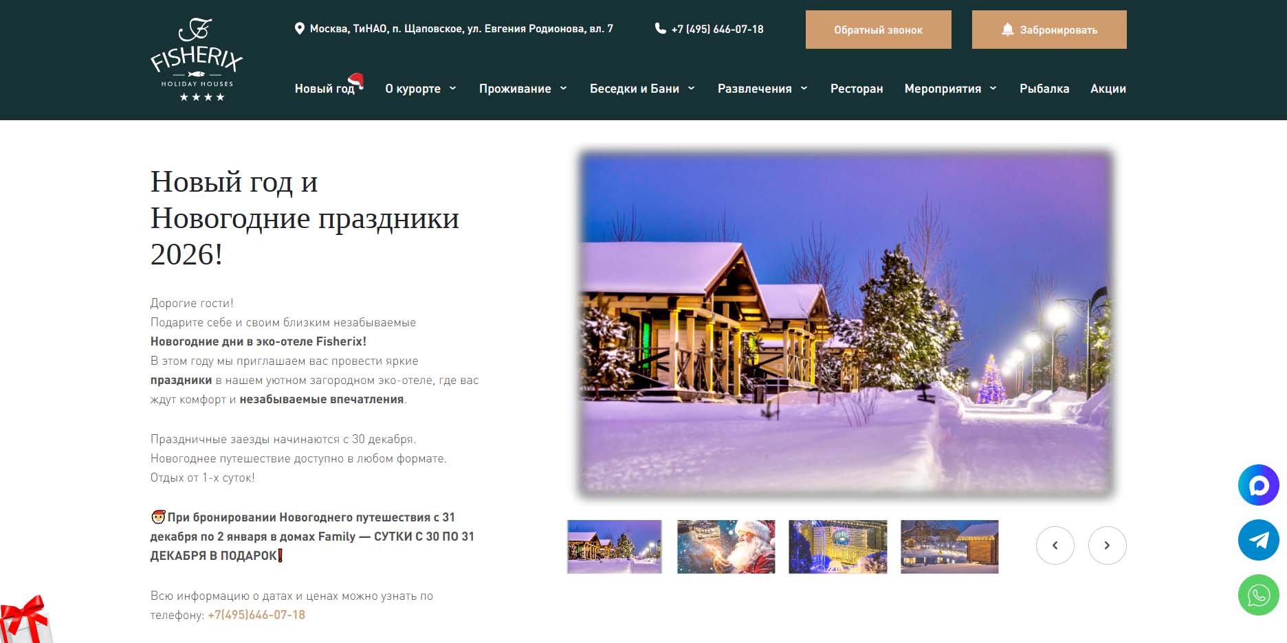 Проект ориентирован на поклонников рыбалки. Но на Новый год об этом забывают и отель становится более традиционным. Весь он состоит из небольших домиков — всего семь видов в разном стиле и разного размера. Есть банный комплекс и ресторан.