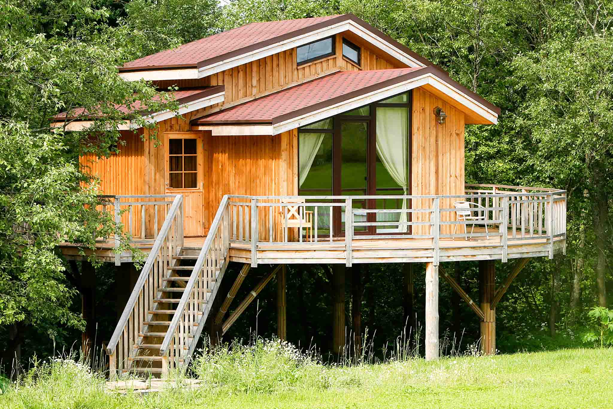 На территории агротуристического комплекса расположен первый в России экоотель на деревьях: стволы проходят прямо сквозь панорамные веранды домиков. На какой высоте дома? Около 2,5–7 метров. Можно выбрать шале с баней или номера в альпийском стиле. Есть А-образные домики из дерева, с панорамными окнами, рассчитаны на четырех человек. Можно выбрать маленький дом на дереве для двоих.