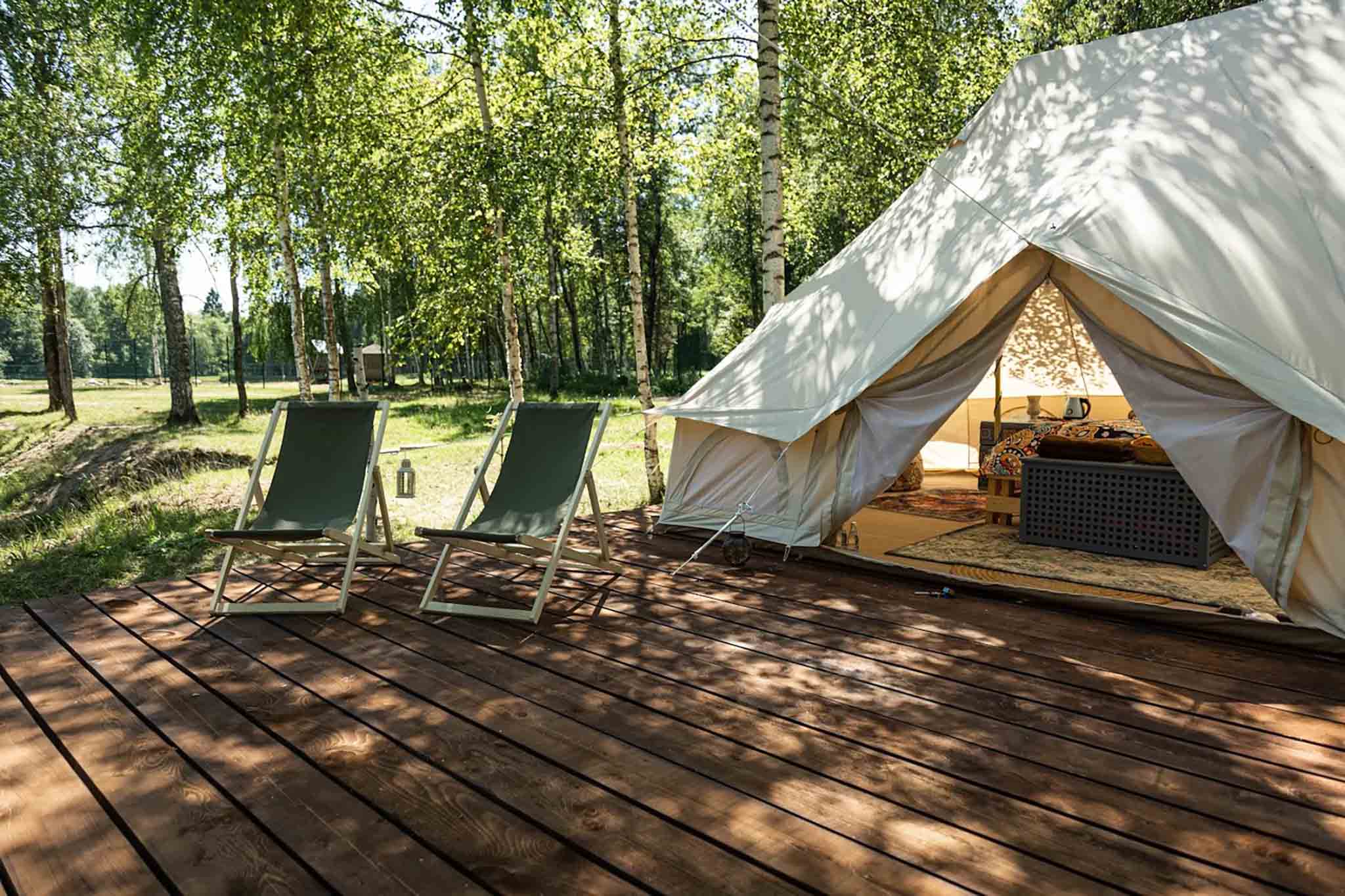 В Щелковском районе Подмосковья есть известный рыболовный клуб на реке Лашутка. А при нем — глэмпинг. Состоит из сафари-тентов. Некоторые стоят прямо на пирсе. То есть при желании можно рыбачить, буквально сидя на кровати. За рыбалку надо платить отдельно, так как водоем зарыбляют и обслуживают профи. Есть баня-бочка, зоны барбекю. Открыт ресторан — можно заказать доставку еды в номер. В каждой палатке обустроена мини-кухня.