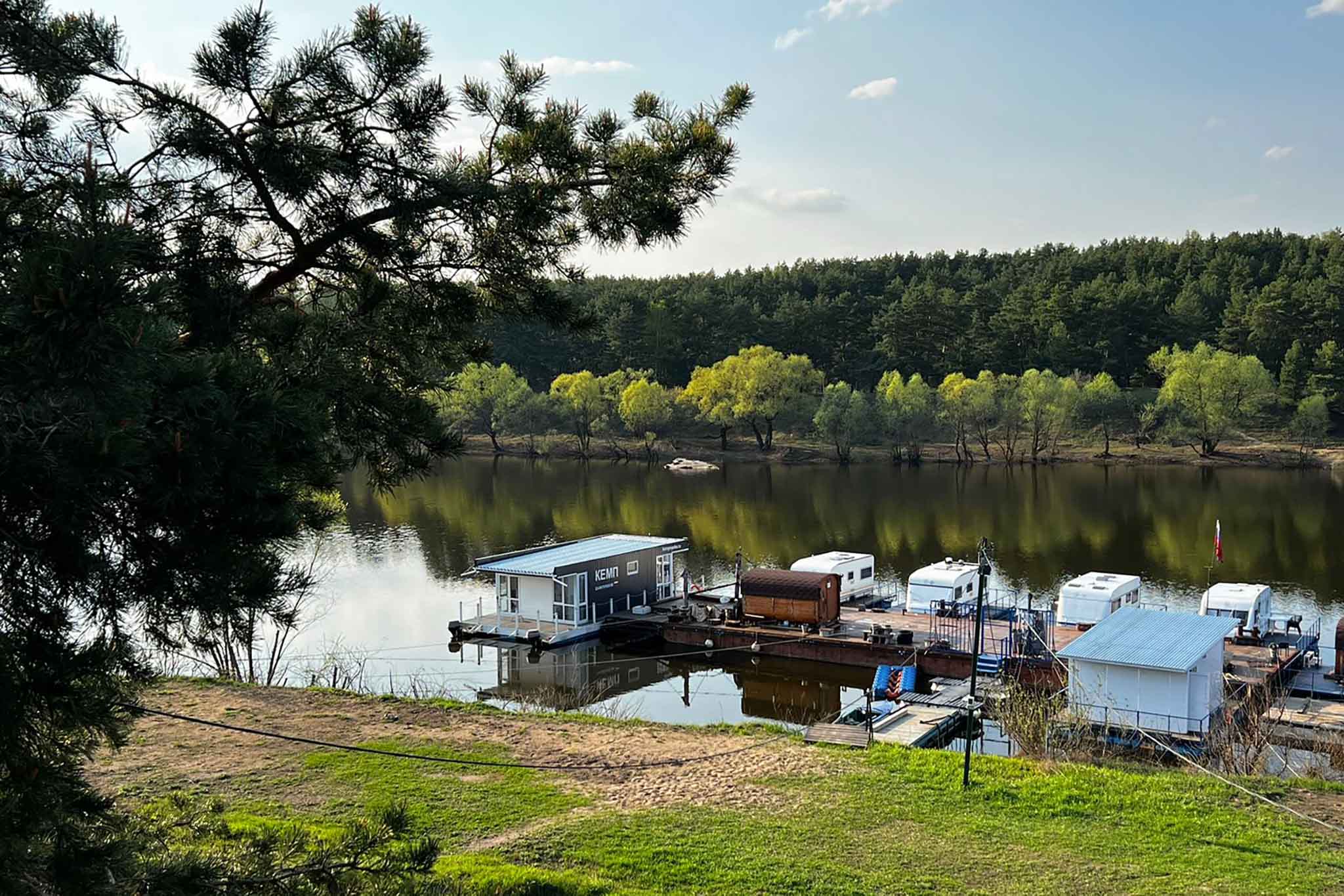 Чтобы добраться сюда, надо с Придорожной улицы в Ступине свернуть на ул. 4-я (так и называется) и ехать по проселочной дороге в сторону реки. Тут песчаный пляж и несколько хаусботов — это плавучие дома-пантоны. Можно снять прогулочный кораблик с местным шкипером. Доступны баня-бочка, детская игровая площадка. Правда недалеко проходит железная дорога, так что слышно стук колес. Одним не мешает, других напрягает. Но все сходятся во мнении, что пейзажи тут особенно в погожий денек завораживающие.