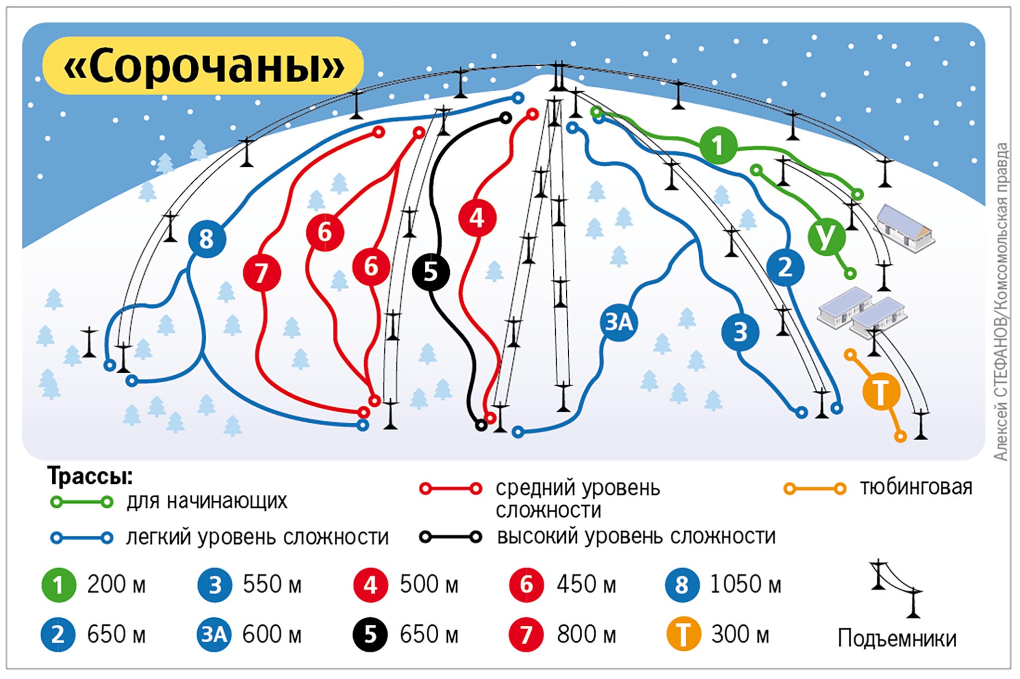 В «Сорочанах» учебных трасс и для новичков — всего по одной, но есть еще трассы начального и среднего уровня — они не слишком крутые и протяженные. Так что с тренером можно заниматься и на других склонах.