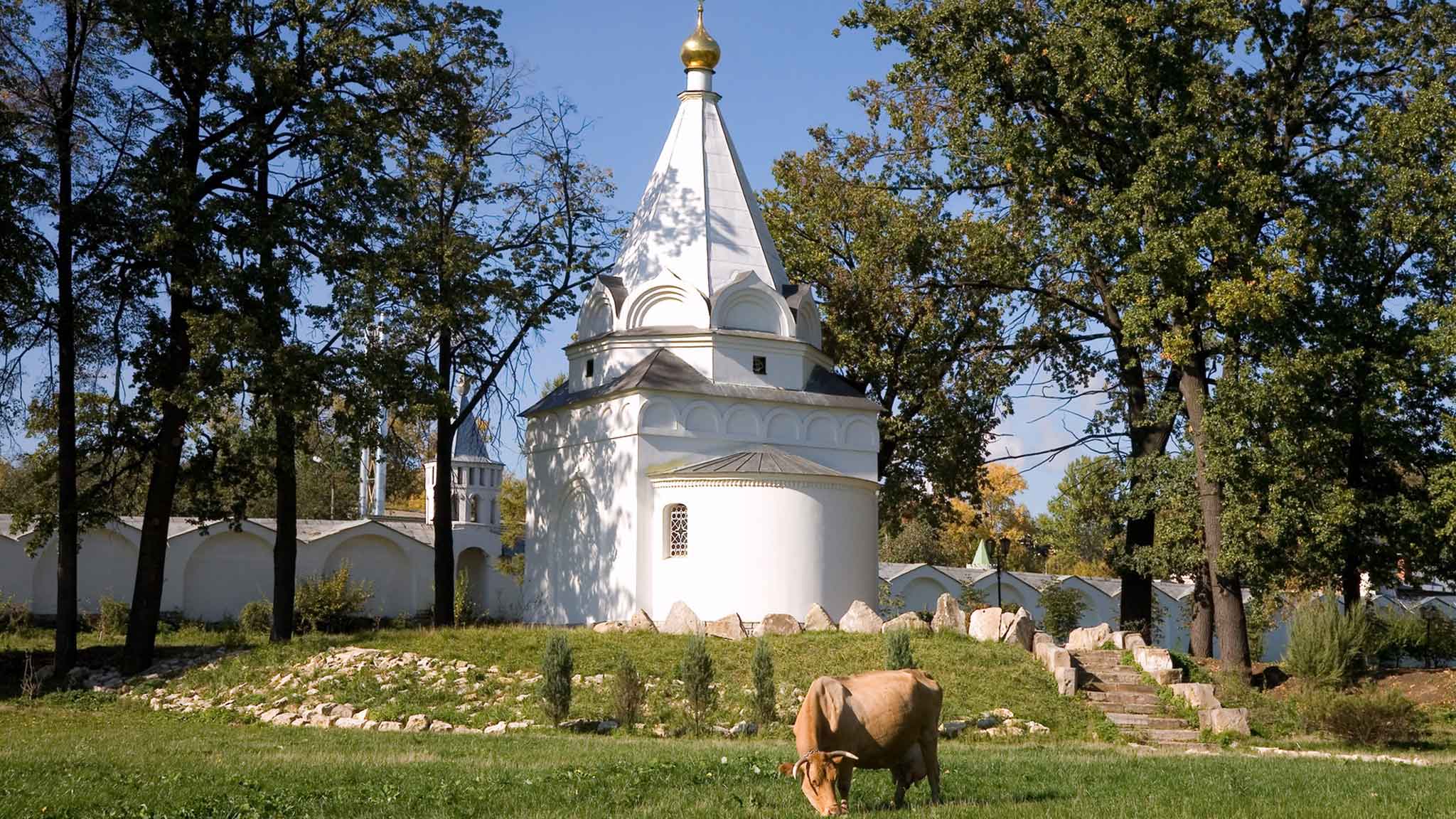 — В монастыре есть сооружение, менее популярное, чем остальные, между тем довольно интересное. Это Палестинская (Иерусалимская) стена, смотреть на нее нужно с внешней стороны и на некотором отдалении. Она выполнена по проекту исследователя русской архитектуры Федора Солнцева в духе древнерусских икон, на которых святые города представлены в виде большого количество башен и храмов. Солнцев именно в этой стилистике сделал часть стены Николо-Угрешского монастыря. Поэтому она воспринимается не просто как ограждение, а будто икона, воплощенная в архитектуре. Обычно туристы проходят мимо и не обращают внимания — просто по незнанию.