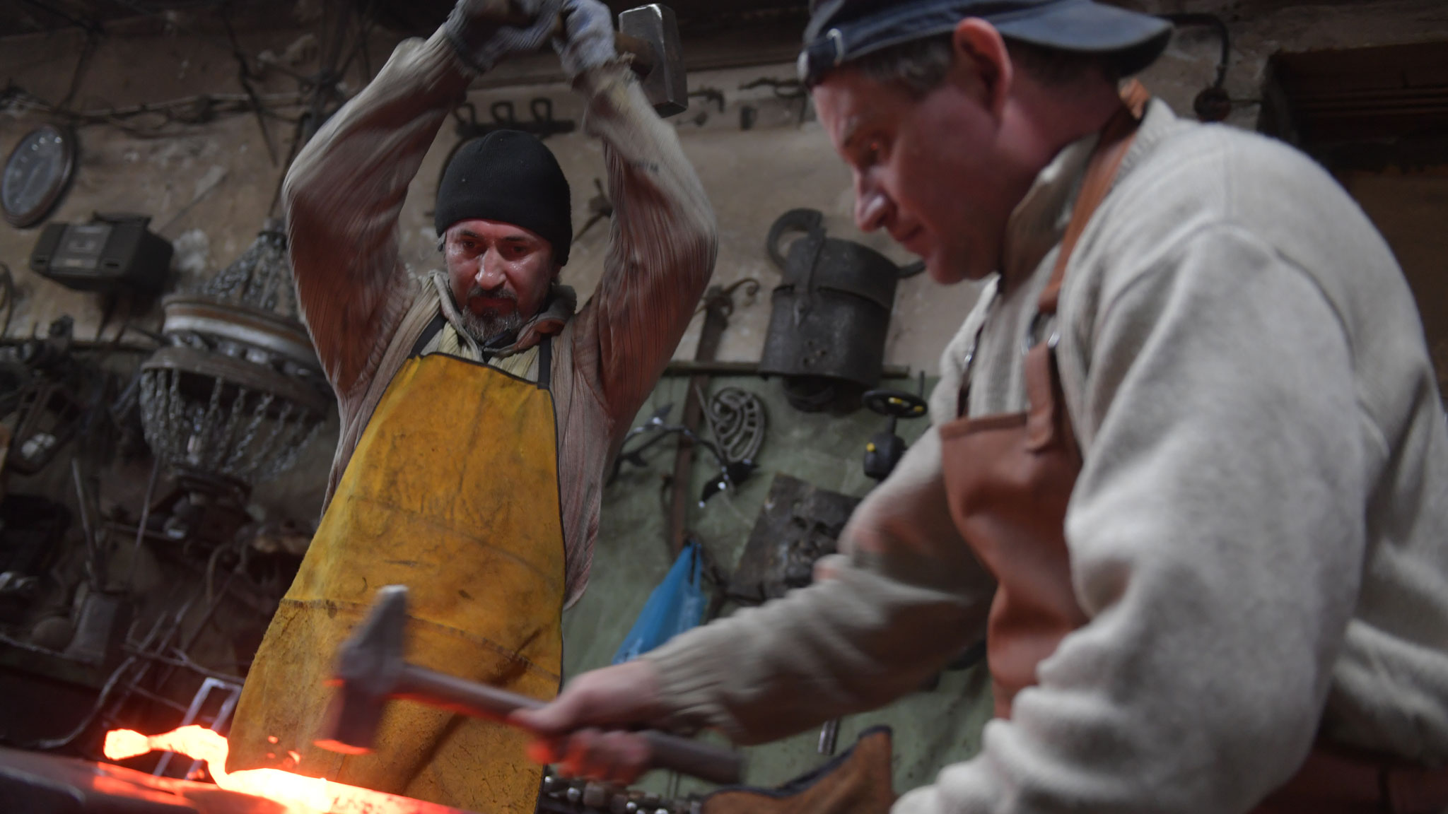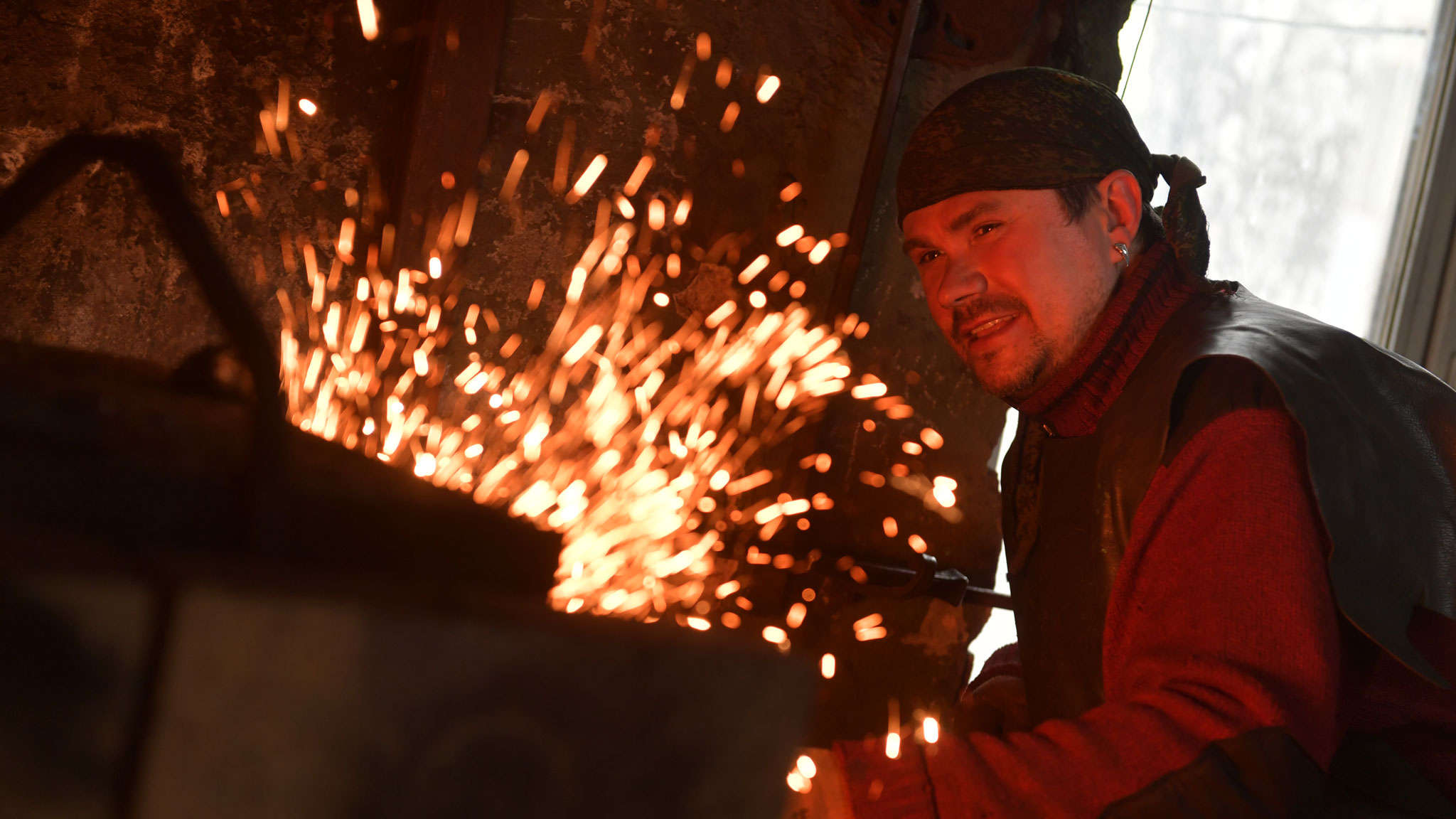 Другой кузнец, Александр Беляев, любит разнообразие новых форм и работу с горячим металлом. Он может изготовить хороший меч за неделю. В средневековье на создание такого оружия уходило времени в разы больше. Сейчас современные технологии и инструменты, готовая хорошая сталь облегчают работу. Газовая печь позволяет быстро разогреть металл для ковки. Но в мастерской не отказались от работы по-старому, на углях, где металл раскаляется добела. В такой обстановке кузнец берется за молот и ощущает себя настоящим мастером.