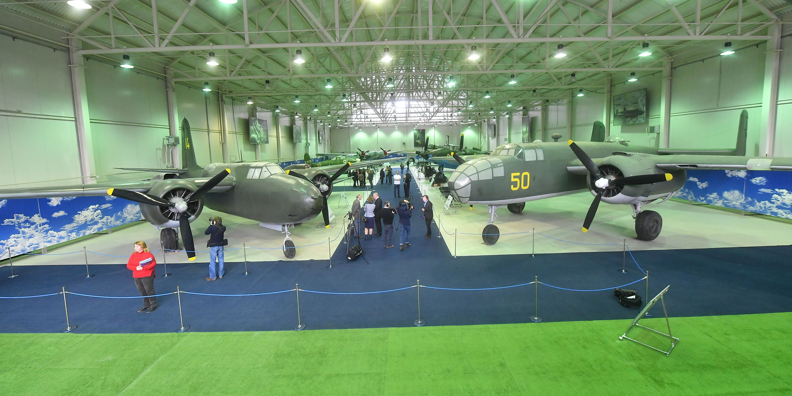 Экспозиция расширялась на протяжении всей истории Музея ВВС. Есть как первые машины начала прошлого века, так и позднесоветские бомбардировщики и пассажирские лайнеры. Представлены самолеты и вертолеты (и даже аэросани!), разработанные главными представителями конструкторского бюро: Тушина, Ильюшина, Туполева, Сухого, Яковлева, Миля, Антонова. Есть машины, на которых летали советские асы (например, истребитель Ла-7 Ивана Кожедуба). Кстати, одни из самых популярных экспонатов — французский биплан «Фарман IV» и русский С-22 «Илья Муромец» — воссозданы на киностудиях и переданы после съемок музею.