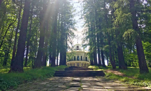 Спуститесь ниже и обернитесь: перед вами будет главный усадебный дом, стоящий на возвышенности, в обрамлении тех же лиственниц.