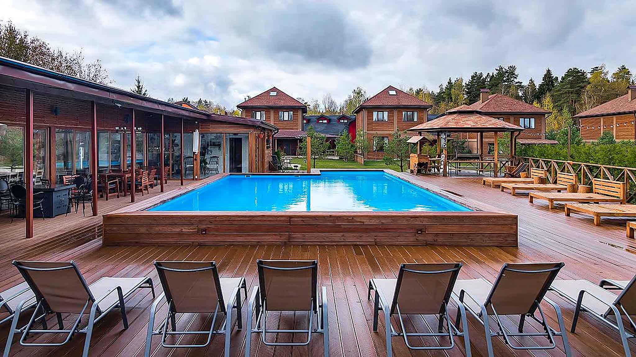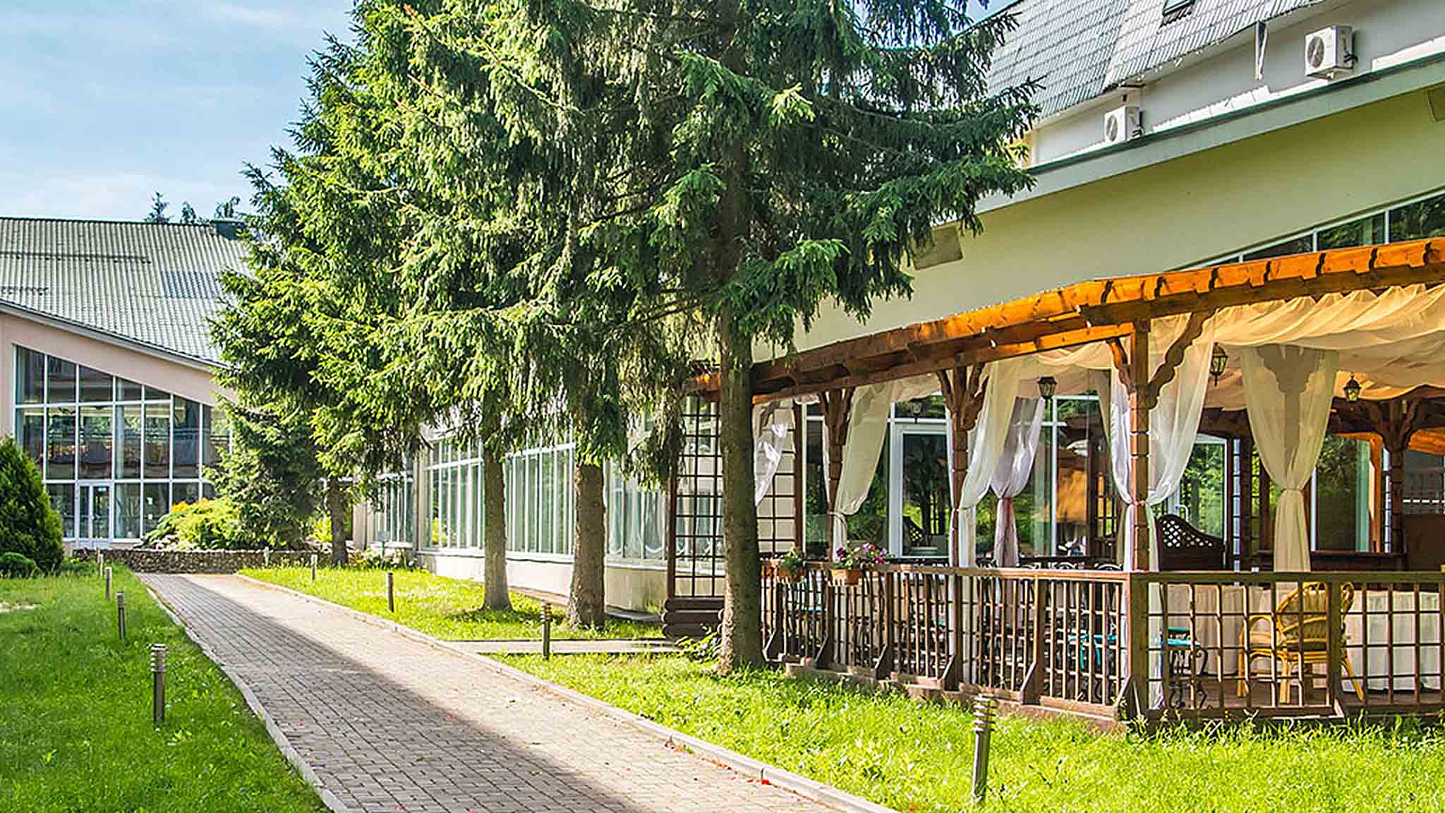 Этот загородный отель прекрасно подходит для активного отдыха и долгих прогулок на свежем воздухе — здесь есть практически все: бассейн, фитнес-центр, квадроциклы, пейнтбол, караоке, бильярд, боулинг, рыбалка, веревочный городок, спортивные площадки. Для сладкоежек работает своя кондитерская — обязательно попробуйте ароматный медовик или изысканный лимонный тарт.