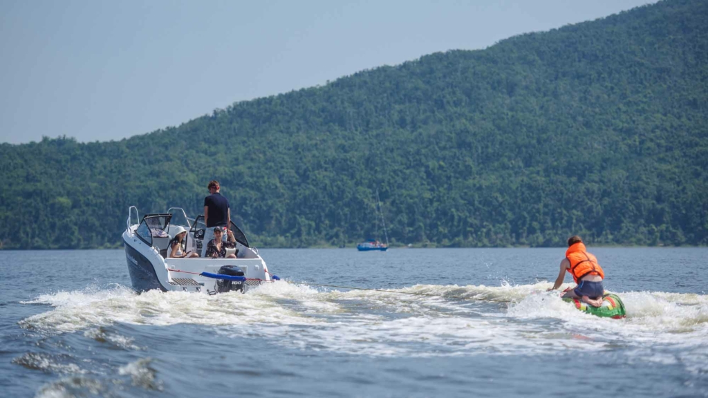 Второй экипаж по уже наметившейся традиции отжег в другой активности – на этот раз на катере и ватрушке. Пока мы исследовали морские глубины, рилз-мейкер, видеограф мобильной съемки Ксения Кулинич и Владислав Титоренко испытали себя на прочность в гонках по волнам на тюбингах от «Водника».