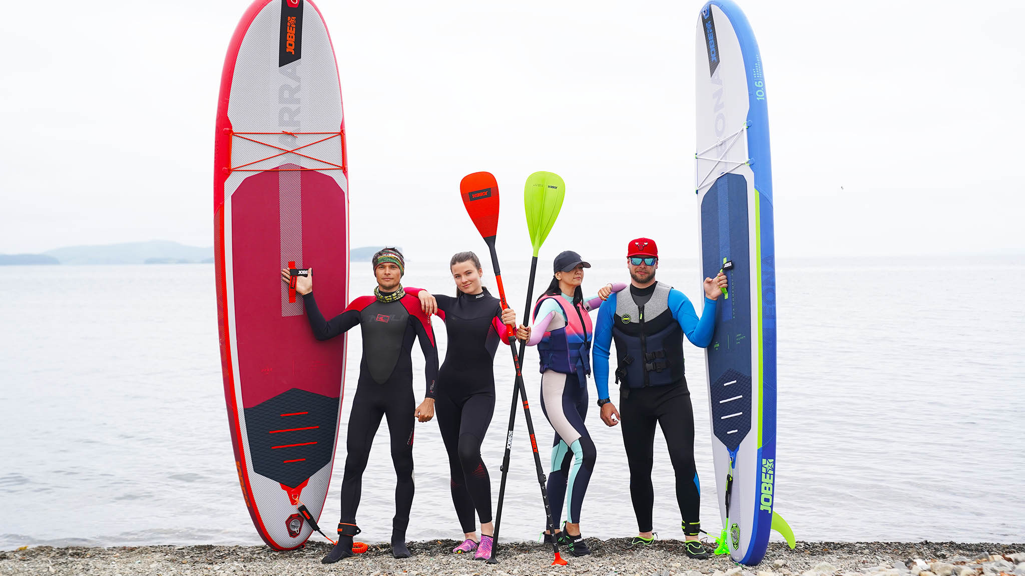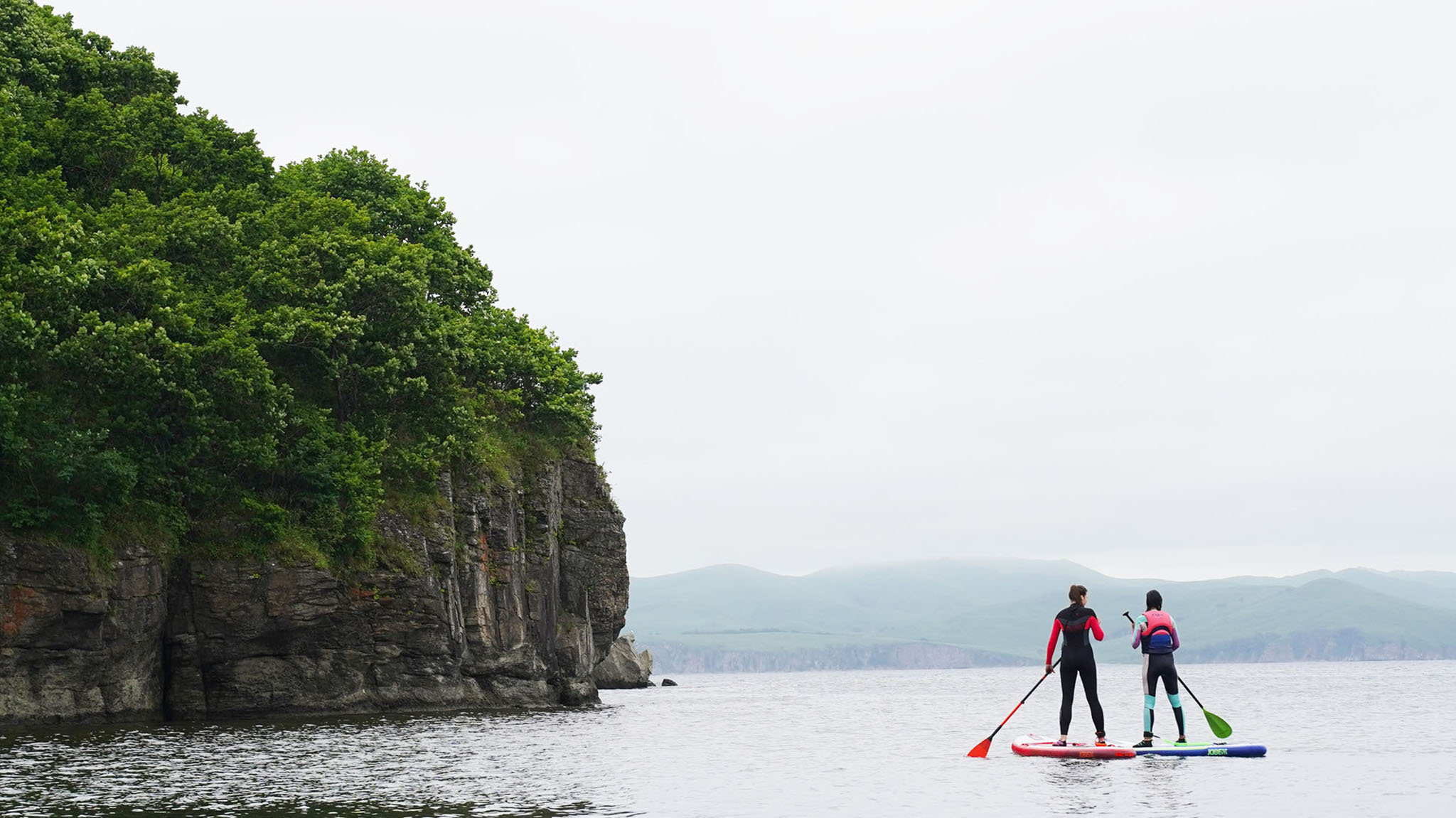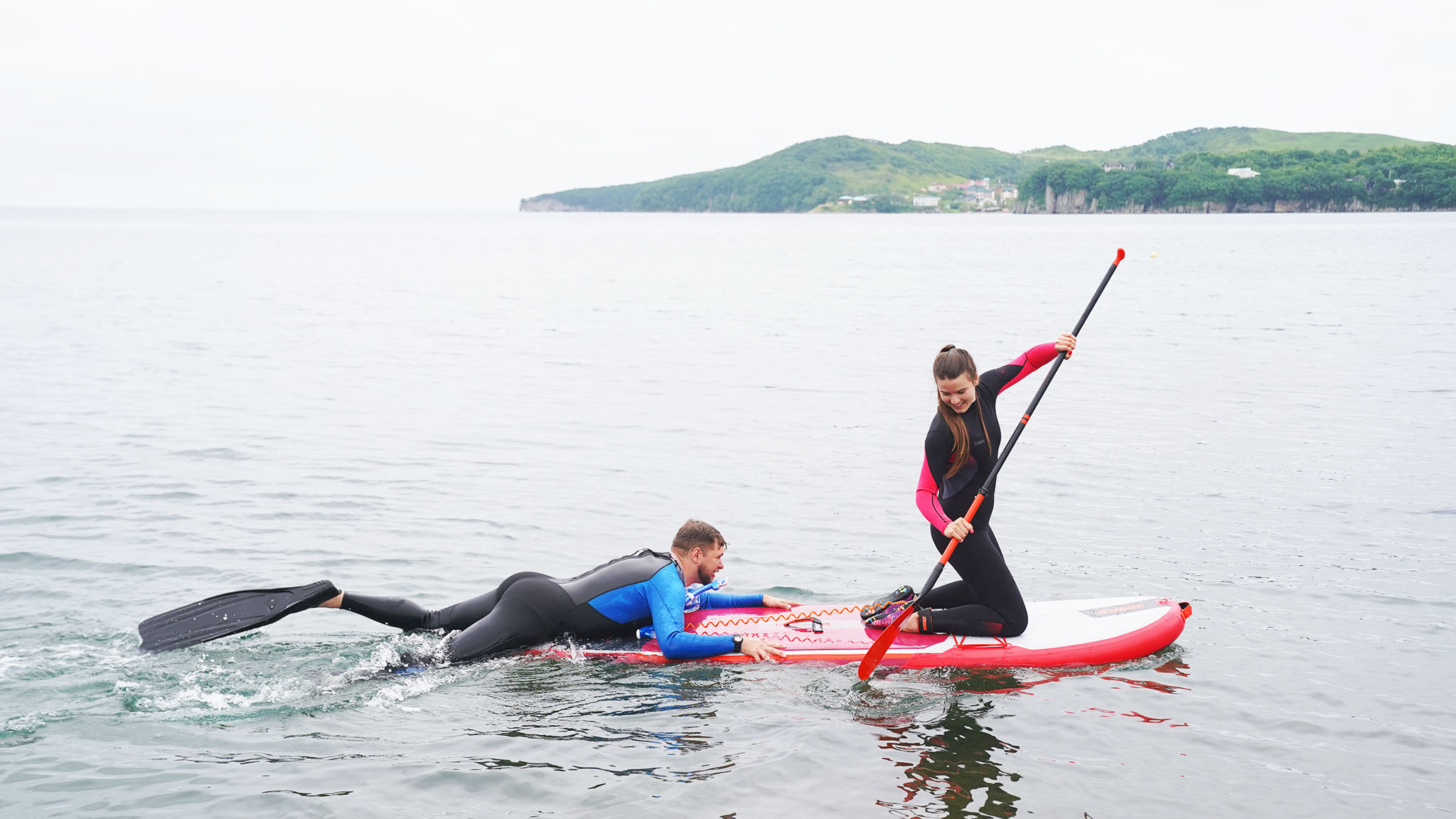 Поел — отдохни. Звучит как девиз, которым мы воспользовались своеобразно. По пути на базу отдыха «Теплое море» попалась уютная бухта Нерпа со спокойным морем и галькой под ногами. Там было решено покататься на SUP-досках. Сергей Дегтярев взял для нас борды и гидрокостюмы из «Спортмаркета на Заре». Пока мальчики надували доски голландской марки Jobe (красивые такие: синяя, красная, и широкие — новичкам будет удобно стоять, а благодаря 15-сантиметровой толщине сапа ноги окажутся подальше от холодной воды), девочки обмундировались. Идейному вдохновителю нашего автопробега Юлиане Виноградовой достался симпатичный эластичный гидрокостюм и легкий защитный жилет.