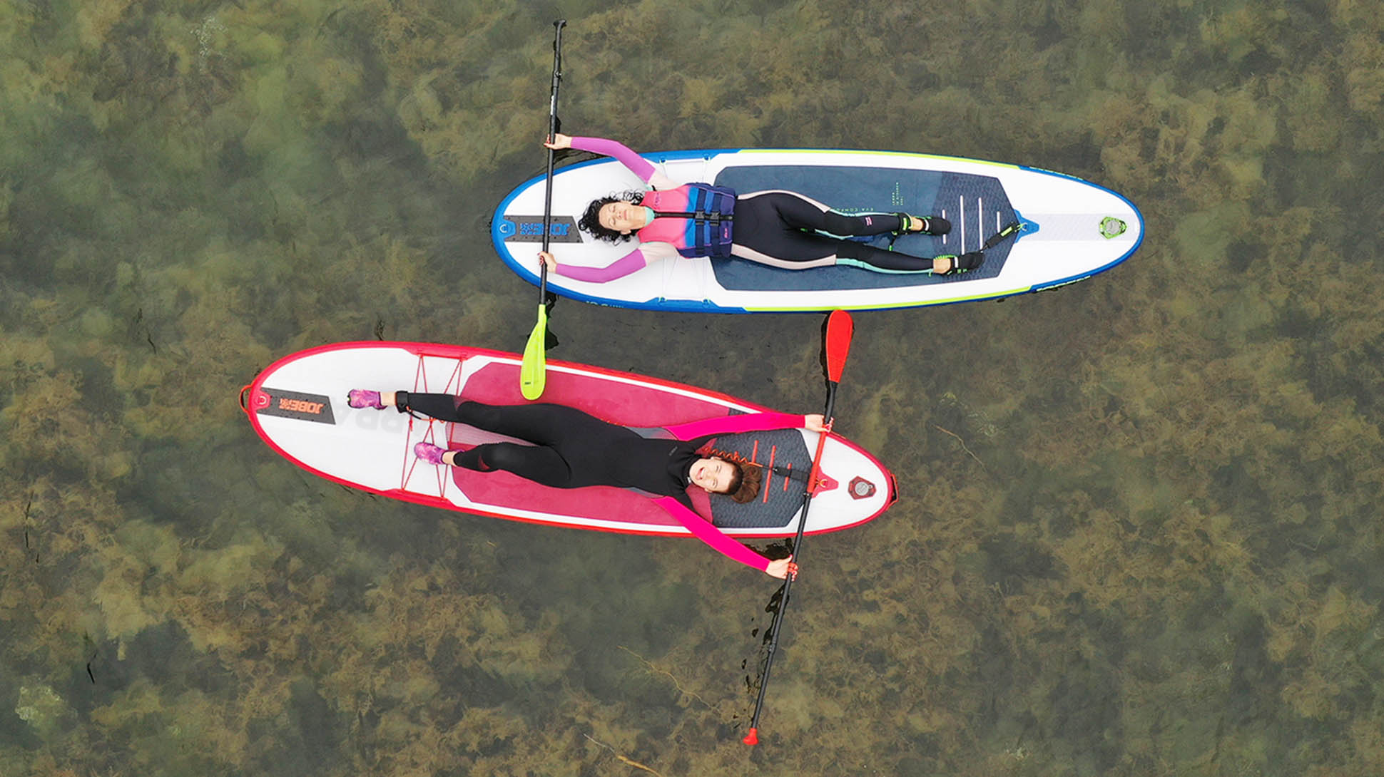 Когда все приготовления были закончены, девочки отправились покорять доски. Арина Левадняя из проекта Slenergy с таким видом отдыха знакома не понаслышке (оно и не удивительно при ее насыщенной и активной жизни), а вот Юлиана встала на доску в первый раз. Ее страховал сам Сергей Дегтярев. Он объяснил все правила безопасности и помог правильно встать на сап: сначала на коленях расставить ноги пошире, взять весло широким хватом и уже после этого неторопливо подниматься.