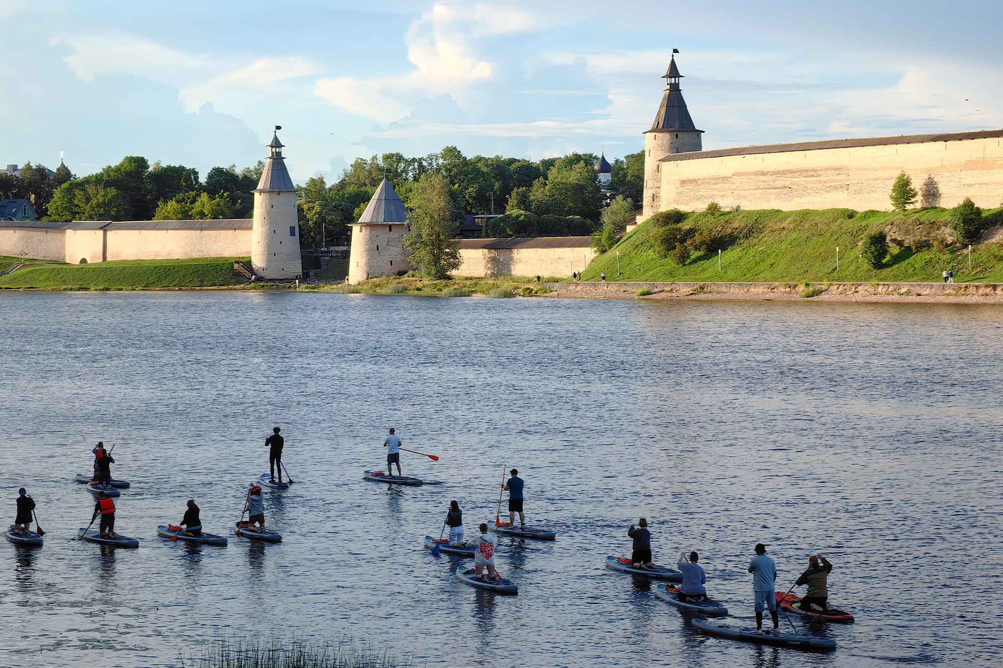 Но дожидаться начала фестиваля необязательно. Покататься на сапах по рекам Пскова и Великая можно в любой день при хорошей погоде. Самое лучшее время — вечерняя прогулка на закате. Начало заплыва — у Ольгинской часовни. Маршрута два — в устье реки Псковы, которая впадает в Великую, или в сторону Мирожского монастыря на городской пляж. С воды вы увидите стены и башни Псковского крома и другие достопримечательности города на фоне закатного солнца.