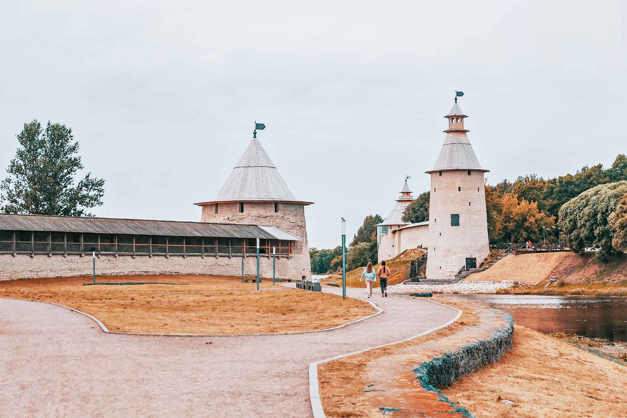 Псковский кремль, который называют Кромом, стоит на высоком мысу в месте впадения реки Псковы в Великую. В X–XII веках здесь находились земляные укрепления и деревянный Троицкий собор, место для строительства которого указала княгиня Ольга. В период Псковской республики (XIV — начало XVI веков) кремль с собором, вечевой площадью и кромскими клетями стал духовным и административным центром Псковской земли. В архитектурный ансамбль, помимо крома, входит Довмонтов город XIII–XIV веков. От него сохранились лишь фундаменты построек, которые обнаружили при раскопках в XX веке. Центральное место в кремле занимает Свято-Троицкий собор 1699 года, внутри которого сохранился семиярусный иконостас высотой 42 метра. На территории кремля находится Приказная палата конца XVII века. В ней открыт музей.