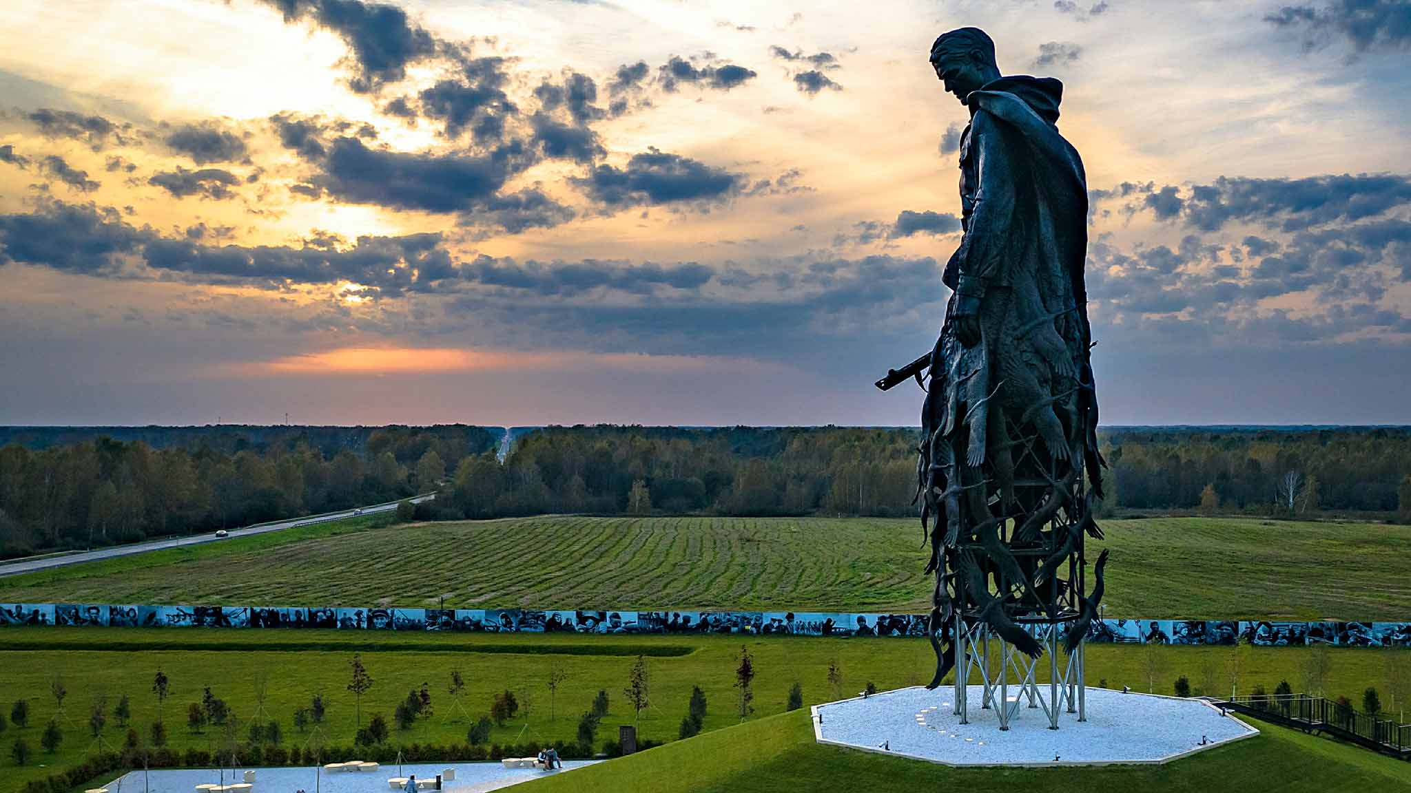 Мемориал создавали порядка трех лет, 80-тонную фигуру солдата собрали из 600 частей и установили на 10-метровом холме. Голова наклонена вниз – то ли смотрит на нас, то ли читает выложенные внизу строки: «Мы за родину пали, но она – спасена». Это тоже из Твардовского – то самое знаменитое стихотворение «Я убит подо Ржевом».