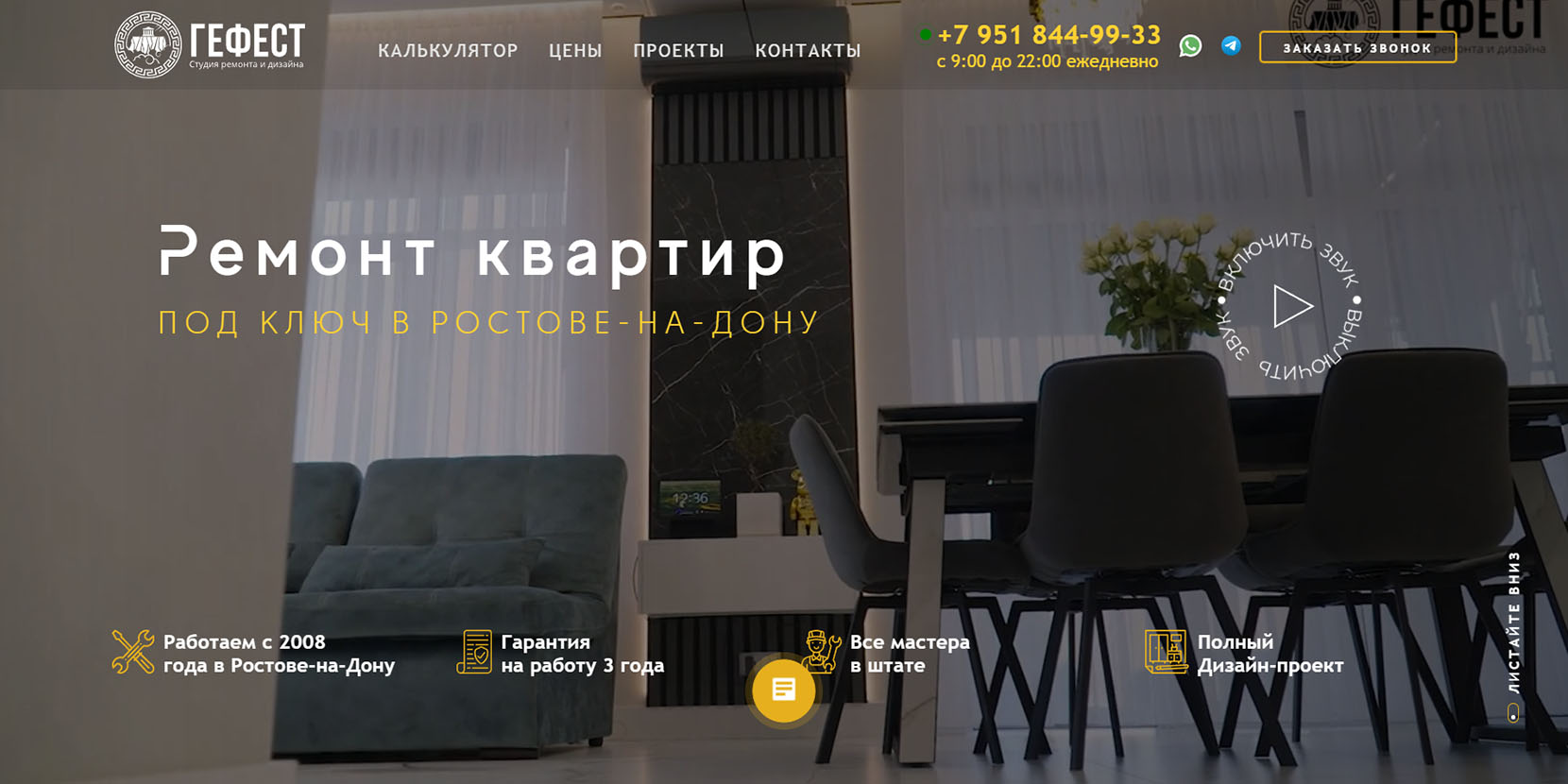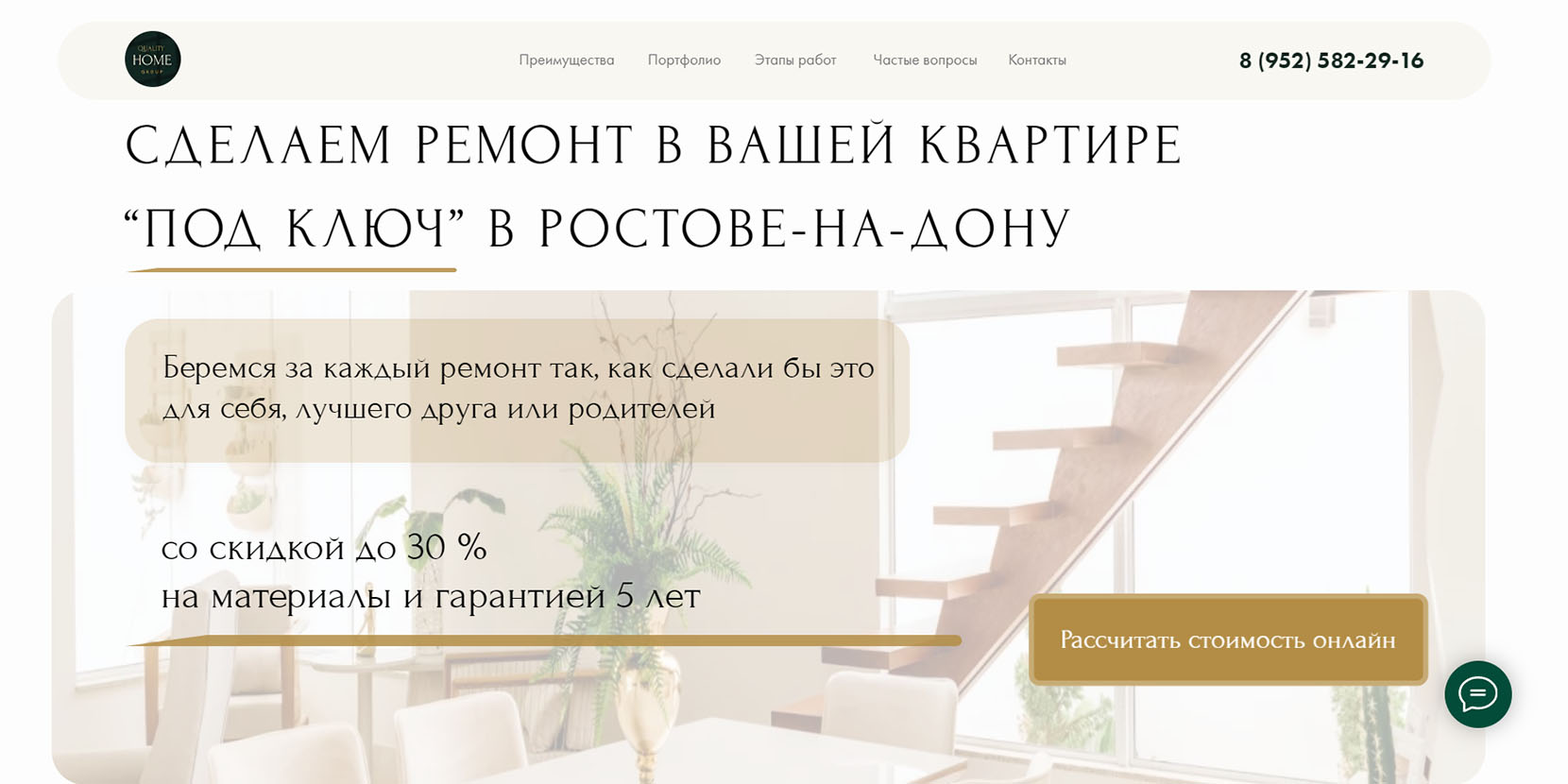 Ремонт квартир и домов под ключ проводят с 2009 года. Замер и смета — бесплатно, гарантии на дальнейший ремонт предоставляются на 5 лет. Комплектация материалами со стороны компании входит в договор. Также среди услуг — поэтапная оплата работ, фиксированная стоимость ремонтных услуг на квадратный метр. Мастера работают с профессиональным, современным инструментом. Где это возможно, ручной труд минимизирован.