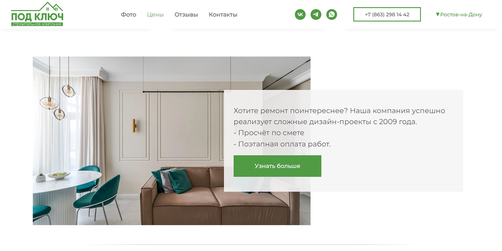 Работают в сфере отделки квартир под ключ с 2004 года. Проводят ремонт в новостройках и вторичном жилье, в частных домах. Компания предоставляет полный спектр услуг — от демонтажа перегородок до монтажа светильников. По итогу ремонта клиент заселяется в готовое жилье. Средний срок для ремонта под ключ составляет 6-8 месяцев. Предлагают три тарифа: демократичный, дизайнерский и премиальный.