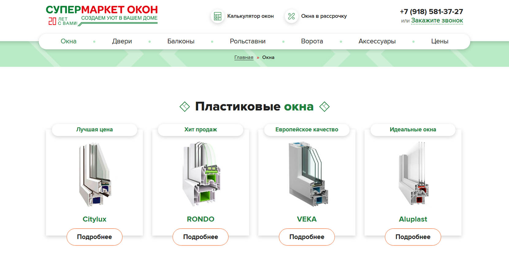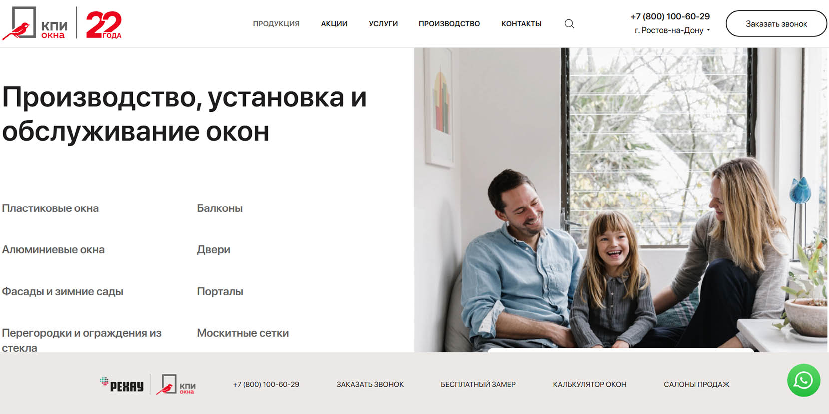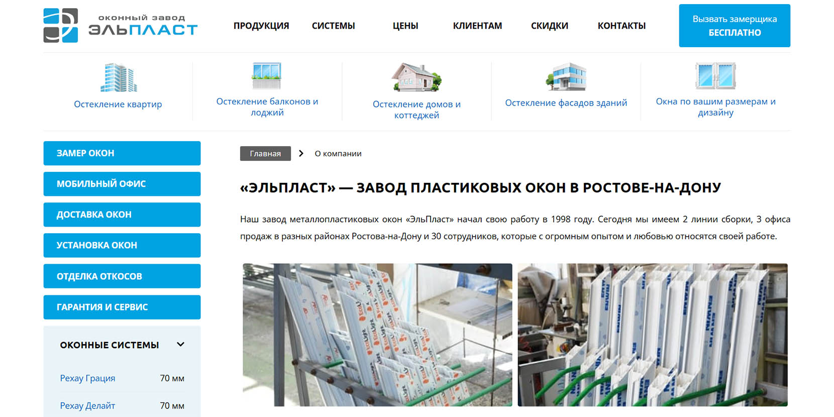 Компания производит пластиковые и алюминиевые окна с 2003 года. Предлагают широкий выбор оконных конструкций — от простых бюджетных до инновационных. Среди услуг: установка окон в квартире и частном доме, остекление веранды и балкона. Замерщик приедет бесплатно, привезет образцы материалов и рассчитает несколько вариантов. На сайте компании отмечено, что на заводе производят более 2 тыс. конструкций в сутки.