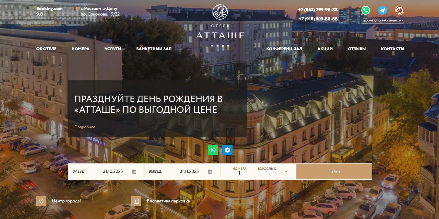 Отель в историческом центре Ростова-на-Дону способен удивить даже самых взыскательных туристов. Многофункциональный гостиничный комплекс уровня 5 звезд предлагает уютные номера с панорамным видом на улицы города, фитнес-клуб, спа-программы, банные церемонии, конференц-зал, ресторан европейской кухни с авторским меню от австрийского бренд-шефа.