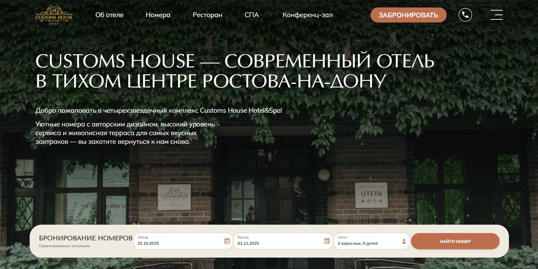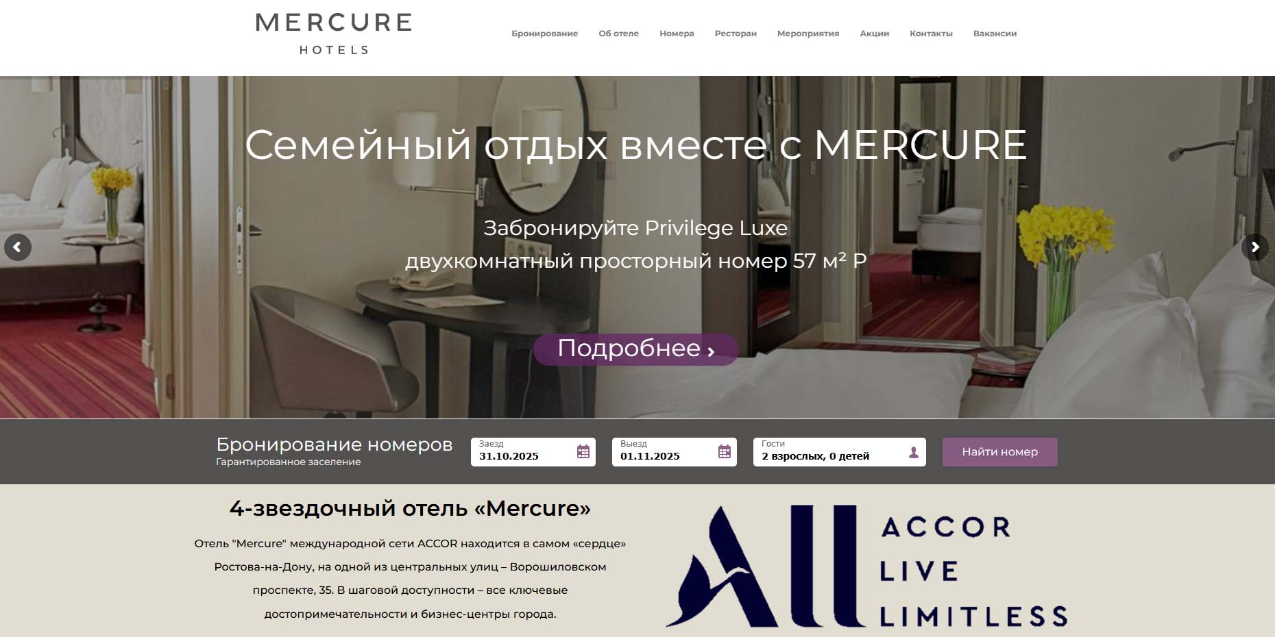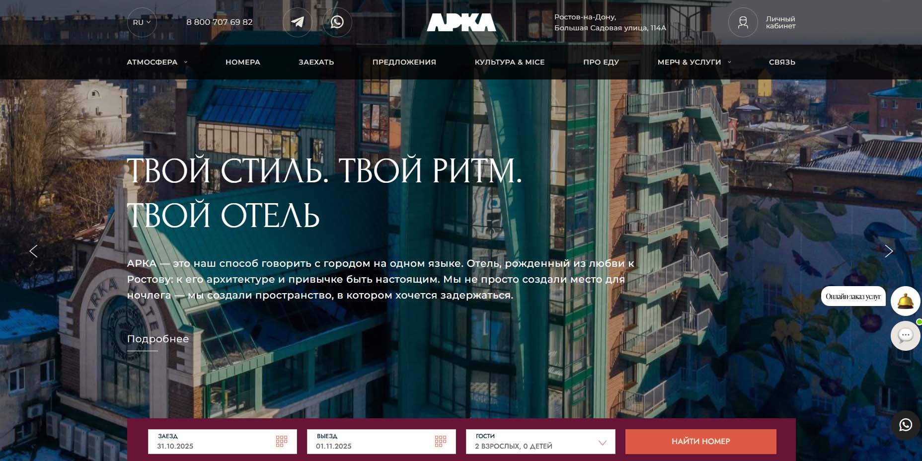 Комфортабельный отель 4 звезды в центре Ростова-на-Дону подходит и для семейного путешествия, и для деловой поездки. Гостиница имеет подземный паркинг, современный спа-центр и номер для гостей с ограниченными возможностями. Каждый этаж оформлен в духе городов старой Европы. Выбирайте, где жить — в старинной Италии, красивой Англии, неповторимой Голландии или любимой России.