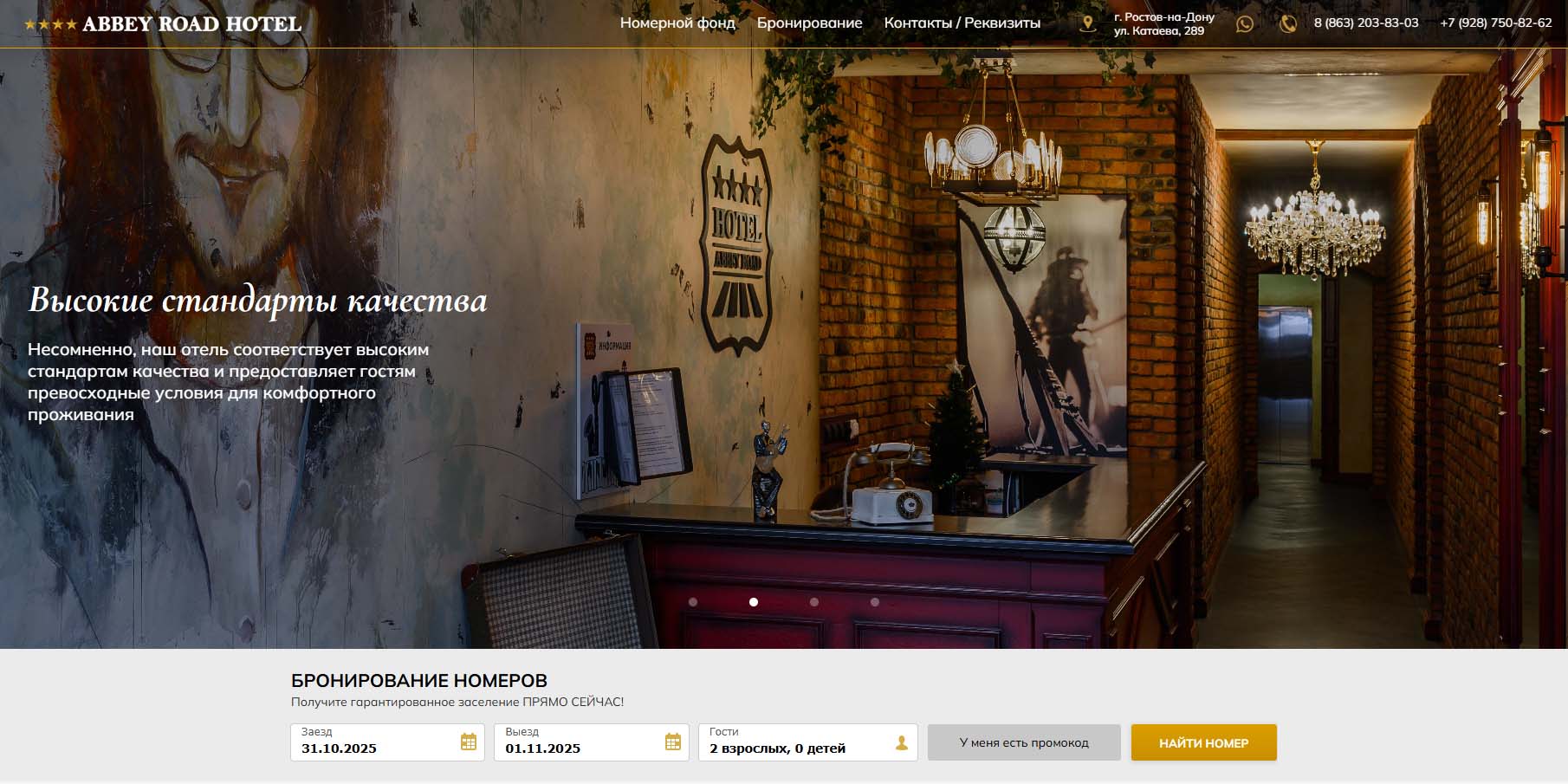 Неподалеку от центрального автовокзала Ростова-на-Дону, на тихой улице, находится комфортный отель с большим выбором номеров — от недорогого стандарта для командировочных до роскошного двухуровневого люкса. В каждом номере есть телевизор, холодильник, электрический чайник и удобная мебель. Гости хвалят отель за чистоту, доброжелательных служащих и эксклюзивный дизайн.