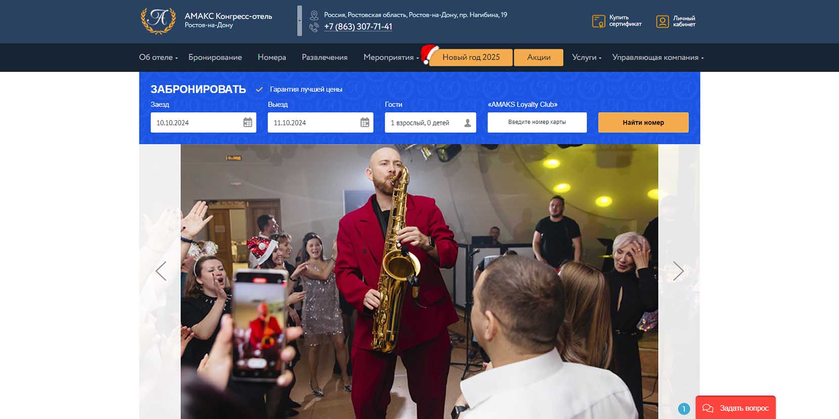 Ресторан «Амакс Конгресс-отеля» предлагает встретить Новый год с максимальным комфортом и массой впечатлений. Тут готовят праздничный стол с обилием авторских блюд и деликатесов и интересную шоу-программу. Доступно проживание в отеле и завтрак по системе «шведский стол». Новогодняя программа начинается 31 декабря в 22:30 (сбор гостей — с 21:30), а заканчивается в 4:00. Дети получают новогодний подарок. У отеля есть своя парковка. Для юных гостей разработано специальное детское меню.