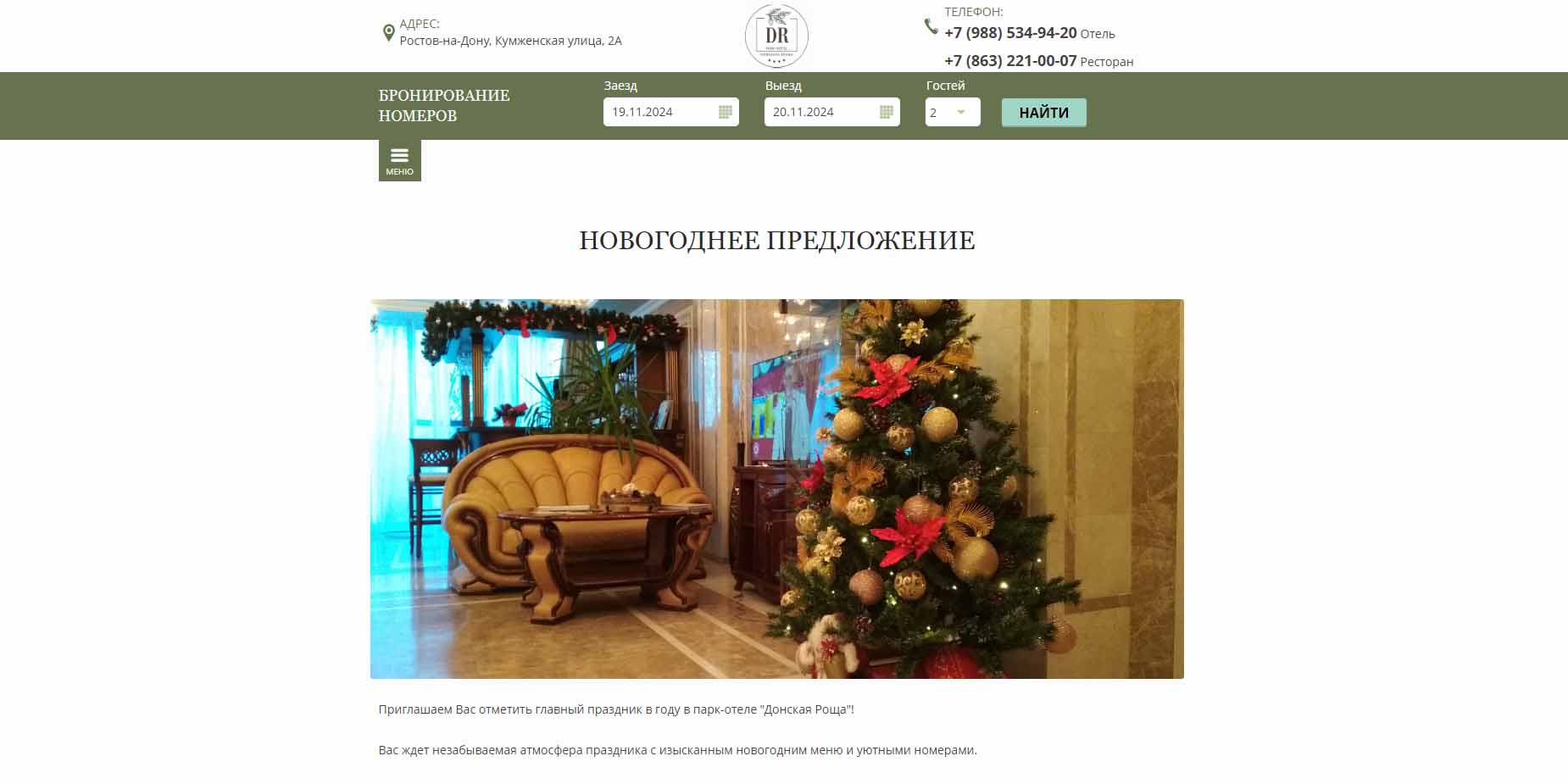 Парк-отель «Донская роща» предлагает встретить Новый год в своем ресторане. Гостей ждет атмосфера праздника, интересная развлекательная программа, хорошая музыка и изысканное меню. «Донская роща» находится в парковой зоне на берегу Дона, так что здесь всегда чистый воздух и нет городского шума.