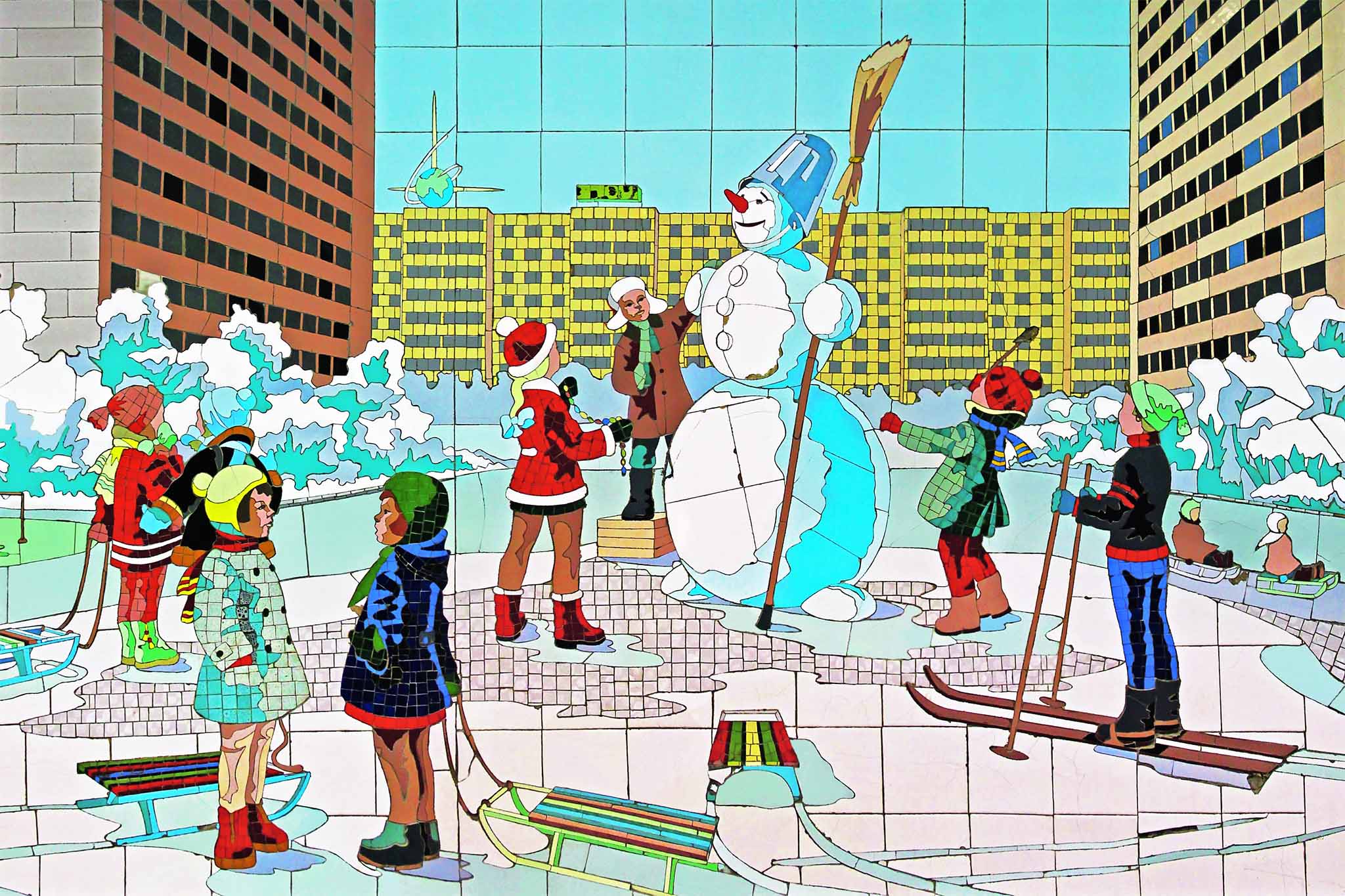 Есть зимние и летние пейзажи, сцены Азовских походов Петра I, боев Гражданской войны и Великой Отечественной, известные персонажи советских мультфильмов, олимпийский Мишка и многое другое. Настоящая картинная галерея под землей. Руководил работами с 1979 по 1982 гг. Юрий Никитич Лабинцев — он был и автором эскизов, тесно общался с историками и краеведами. Мозаику бригада из 7 человек выкладывала вручную, использовали местную шахтинскую плитку и чешскую — для фона, так как она была шире по размеру.