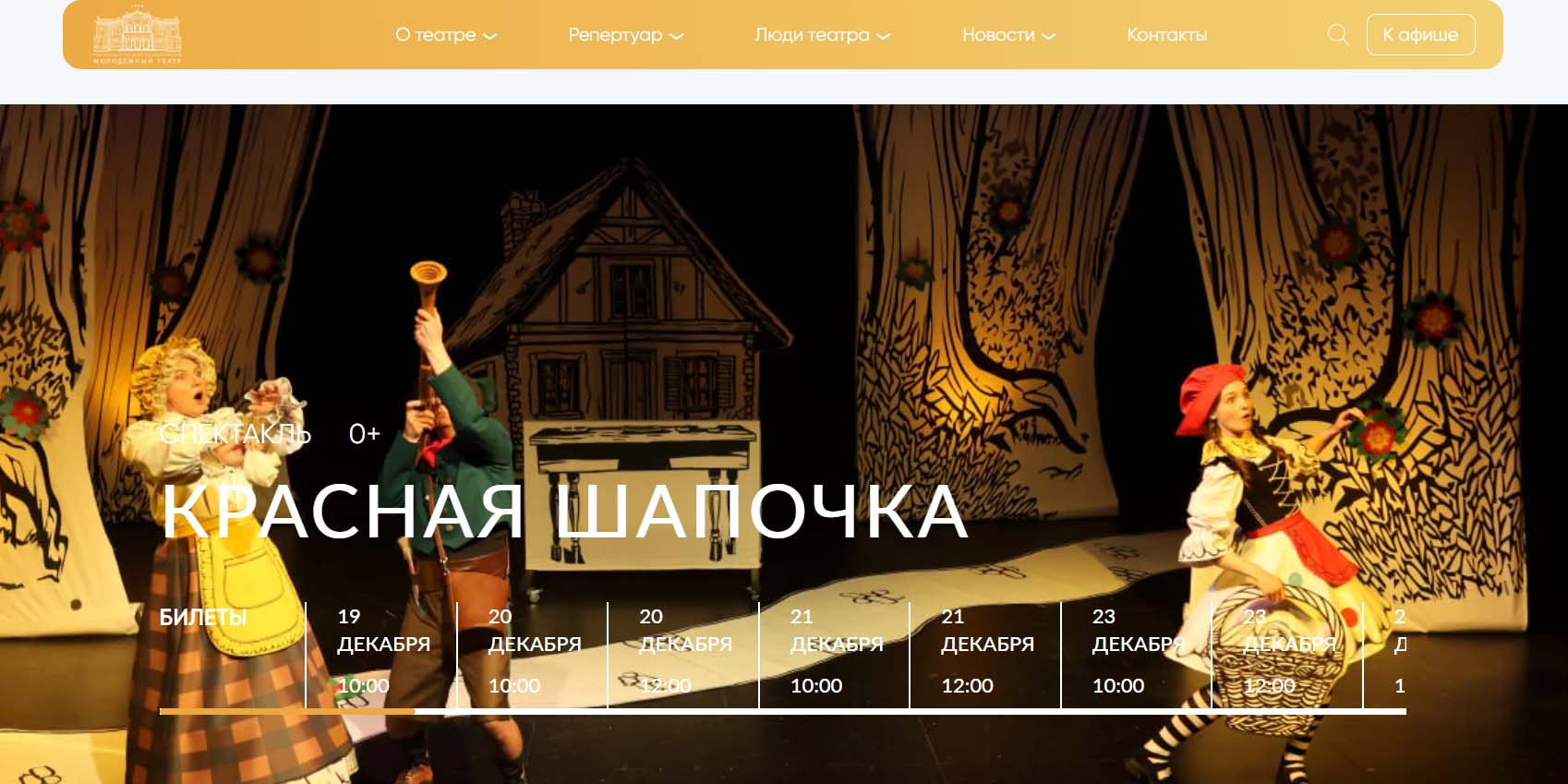 Молодежный театр представит спектакль «Красная Шапочка» по сказке Шарля Перро. Зрители активно участвуют в развитии истории: помогают собрать букет, предупреждают Шапочку об опасности, указывают дорогу. Не обойдется и без доброго волшебника: в конце всех ждет хоровод вместе с Дедушкой Морозом.
