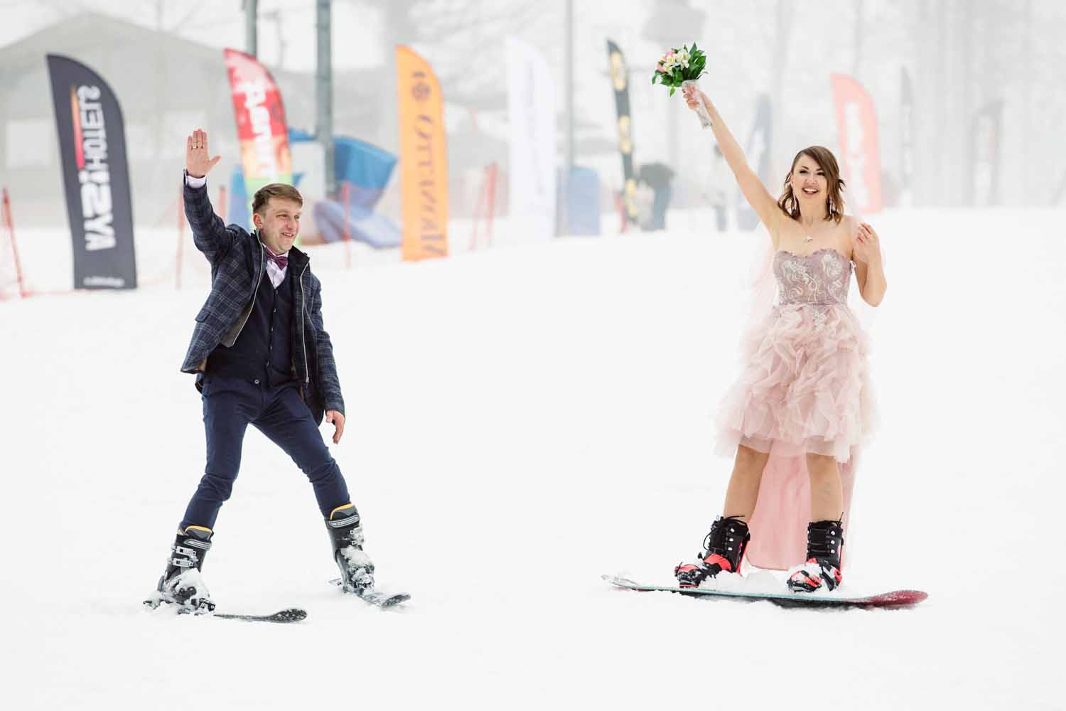 В прошлом году возглавляла «Свадебный спуск» пара из Краснодара, которая отметила на фестивале BoogelWoogel золотую свадьбу. В честь 50-летия брака Галина и Александр Сандульские вышли на старт в костюме и платье, которые сохранили со своей свадьбы. Юбиляры обвенчалась 1 марта 1973 года в Кишиневе. Сандульские катаются на лыжах уже более 40 лет. Двоих детей и четверых внуков они тоже поставили на горные лыжи.
