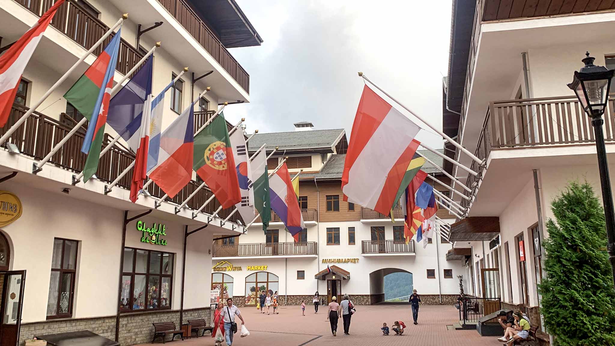 Самая первая площадка, куда вы поднимаетесь по канатке с Розы Хутор ― Горная Олимпийская деревня (1100 м). Построена она была для проживания участников Олимпиады 2014 года, а после стала популярным туристическим местом. Здесь приятно проводить время, гулять по улицам, рассматривать домики с разноцветными флагами стран-участниц, заходить в многочисленные спортивные и сувенирные магазины и отдыхать в кафе и ресторанах.