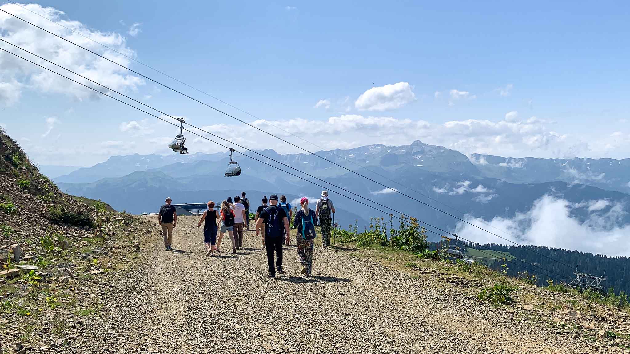 С Розы Пик начинается несколько пеших маршрутов, а также с нее открываются лучшие панорамные виды на Кавказский хребет. Но помимо всего этого на ней располагаются два аттракциона для тех, кому недостаточно только видов гор в телефоне на память, а хочется посмотреть на них из полета, оказаться над ними.