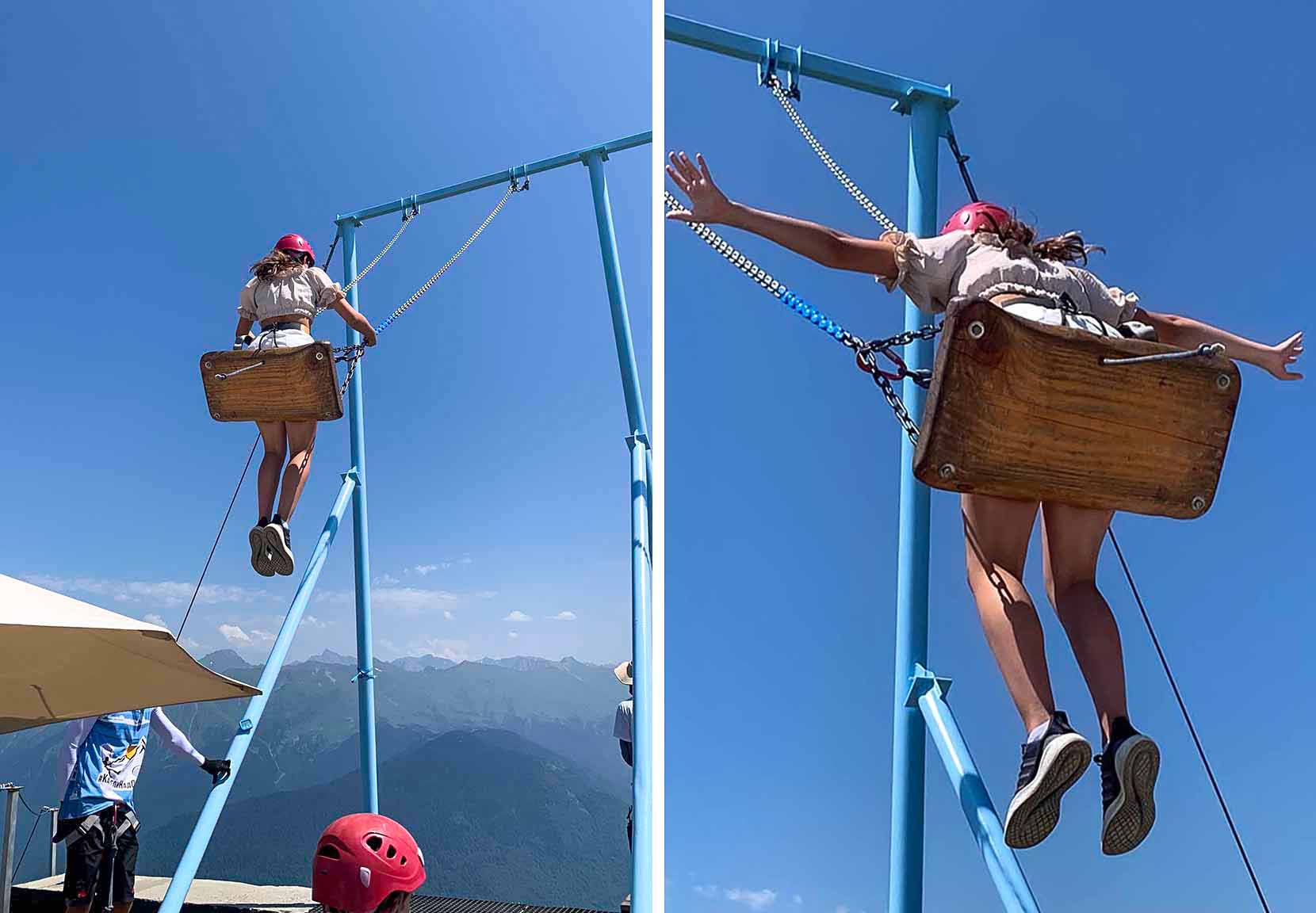 Катание совершенно безопасно, вам также выдадут страховочное оборудование, а рядом все время находятся сотрудники, которые будут вас раскачивать и контролировать силу «полета». После катания можете забрать ваши счастливые фотографии на фоне неба и горных вершин.