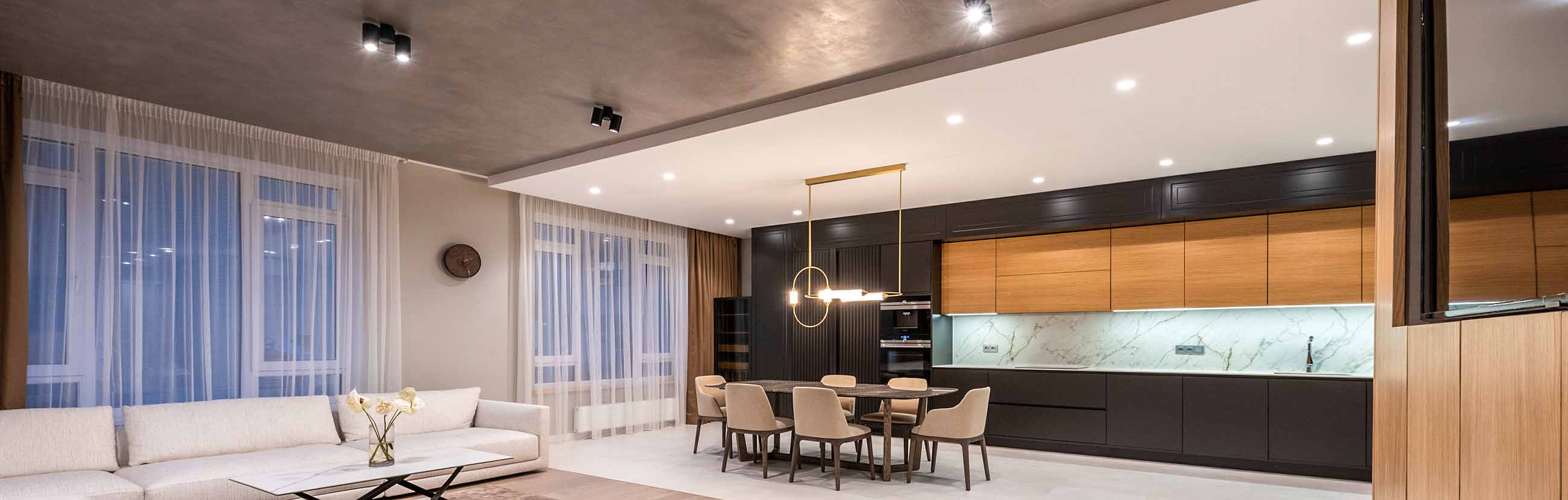 Компания работает на рынке с 2009 года, прекрасно ориентируется в новых трендах, сотрудничает с лучшими производителями и готова воплотить любые желания заказчиков — потолки из ткани и ПВХ с подсветкой, фотопечатью, «парящие», со скрытым карнизом и другие.
