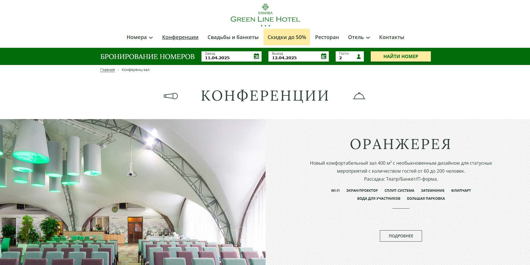 Для аренды доступно три конференц-зала разной вместимости и разного дизайна. Зал «Оранжерея», выполненный в приятных пыльных изумрудно-сиреневых тонах, вмещает до 200 гостей и подходит для статусных мероприятий. Зал «Жемчужный» оформлен в классическом стиле, имеет площадь 110 кв. метров и рассчитан на 120 человек. «Изумрудный» — уютный зал для камерных мероприятий. Во всех залах есть проектор с экраном, wi-fi, сплит-система, флипчарт. Отель располагает большой парковкой.