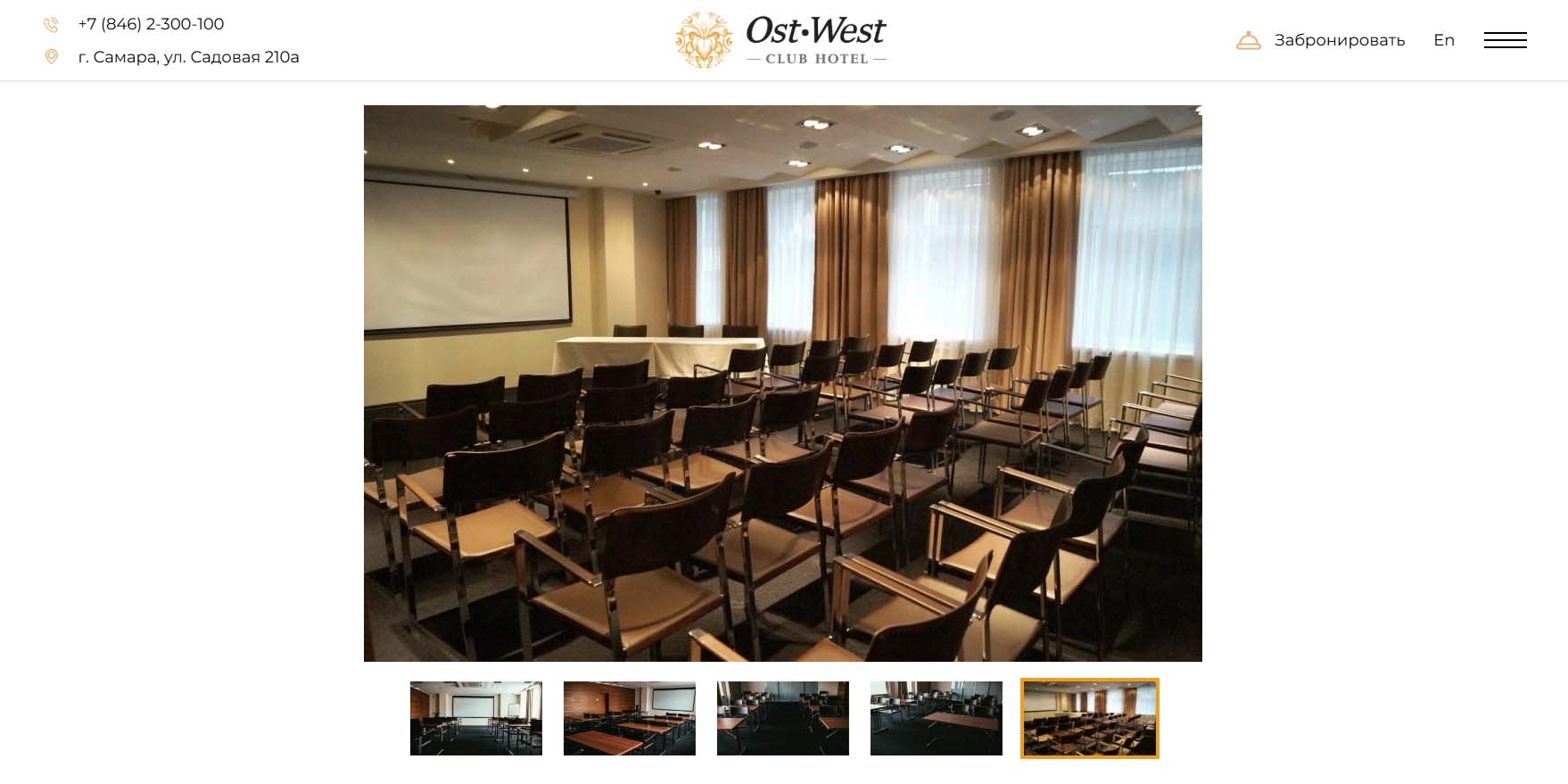 Конференц-зал находится на седьмом этаже пятизвездочного отеля, откуда открывается красивый вид на Волгу и город. Панорамные окна пропускают много света, а шторы блэкаут создают необходимое затемнение для работы проектора. Зал оснащен мобильными звукоизоляционными перегородками, позволяющими поделить помещение на две части разной вместимости. Система кондиционирования поддерживает приятный микроклимат.