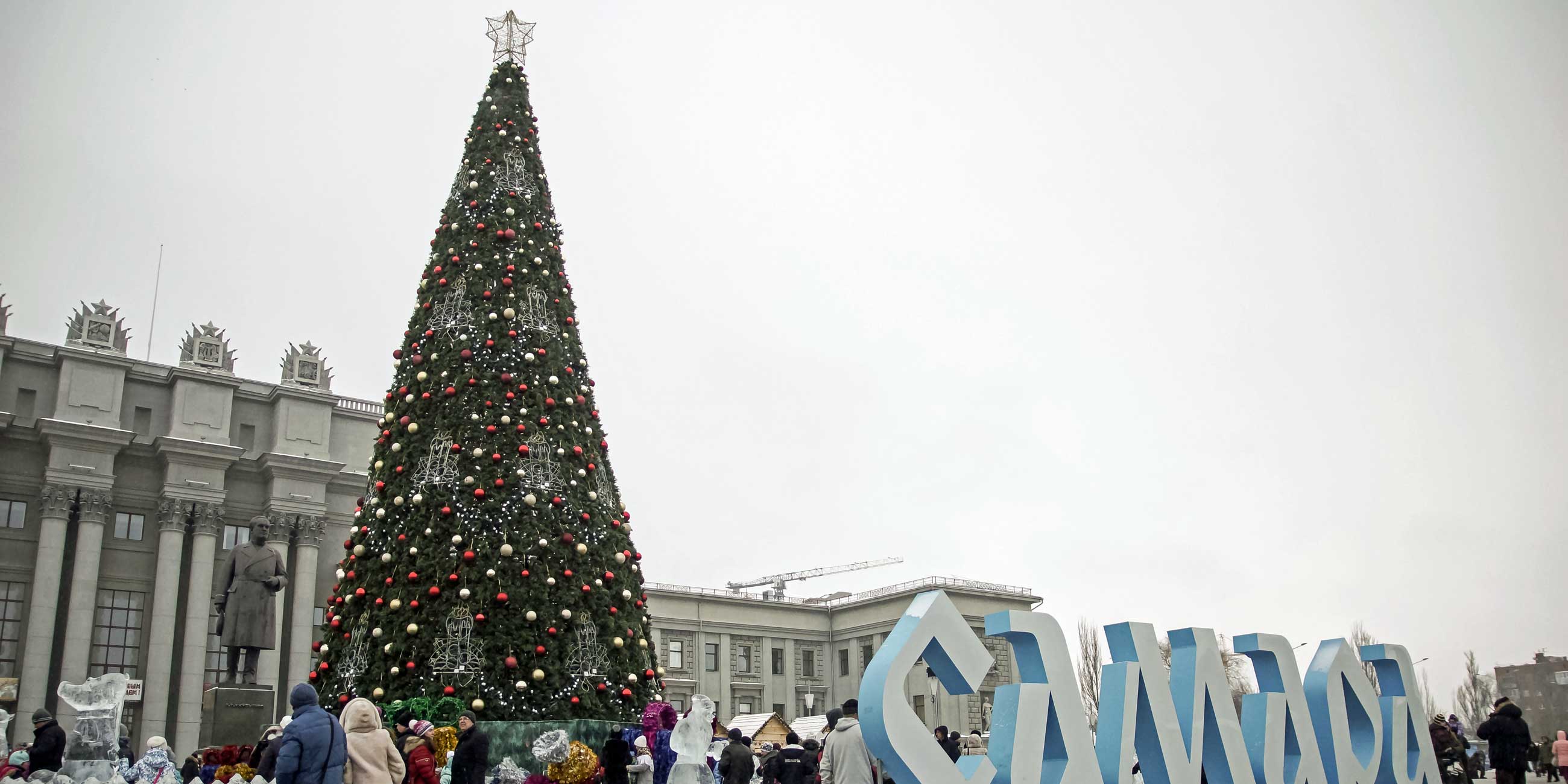 Главную новогоднюю елку в Самаре начали собирать 26 ноября. Полностью праздничный комплекс на площади Куйбышева будет готов к середине декабря, а официальное открытие назначено на 27 декабря.