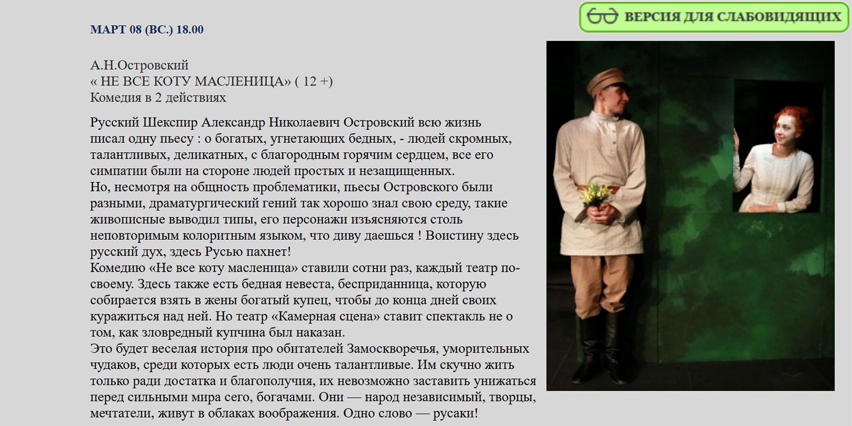 Театр «Камерная сцена» представляет свое видение знаменитой пьесы Островского. В их интерпретации она не о наказании деспотичного дельца, уверенного, что деньги способны решить все, а веселая история про талантливых и независимых обитателей Замоскворечья.