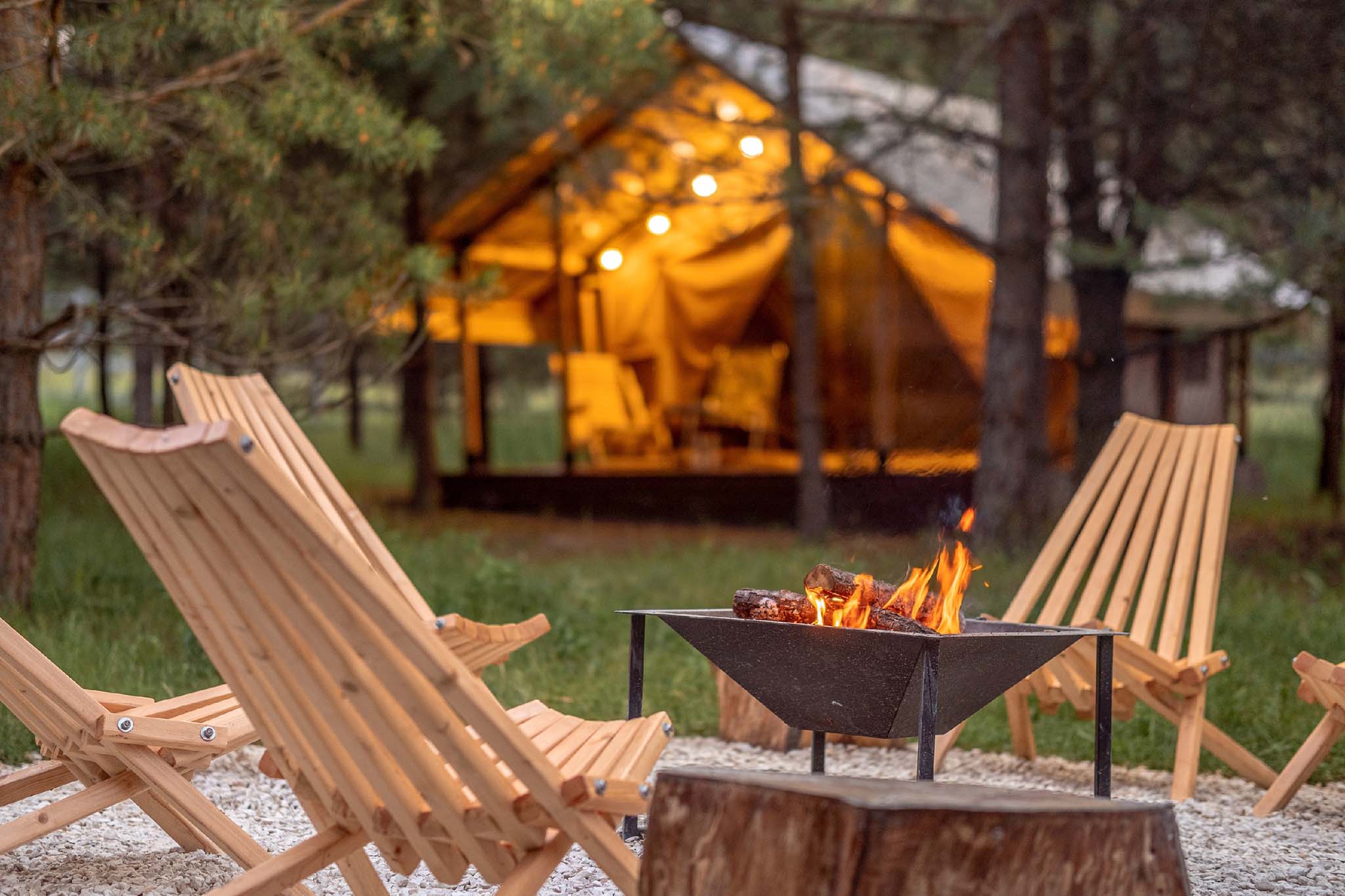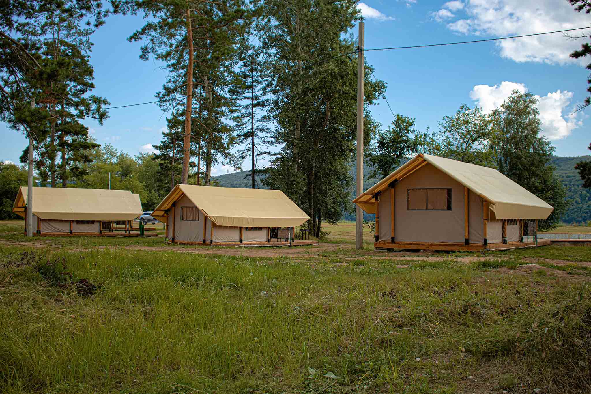 Для желающих отдохнуть в уникальной заповедной зоне Рачейские Альпы построены три современных сафари-тента «Юг», «Призма» и «Фемели» с террасами и экологичными мебельными интерьерами. Путешественникам нравятся лаконичная архитектура и продуманная система вентиляции. На территории выделены места для палаток, прицепов и автодомов, здесь есть электричество, санитарные блоки с душевыми и туалетами, общественная зона и чистая вода. Отдыхающие с удовольствием ходят на обзорную площадку, откуда открывается чудесный вид на «Каменный лес» и большой зеленый бор.