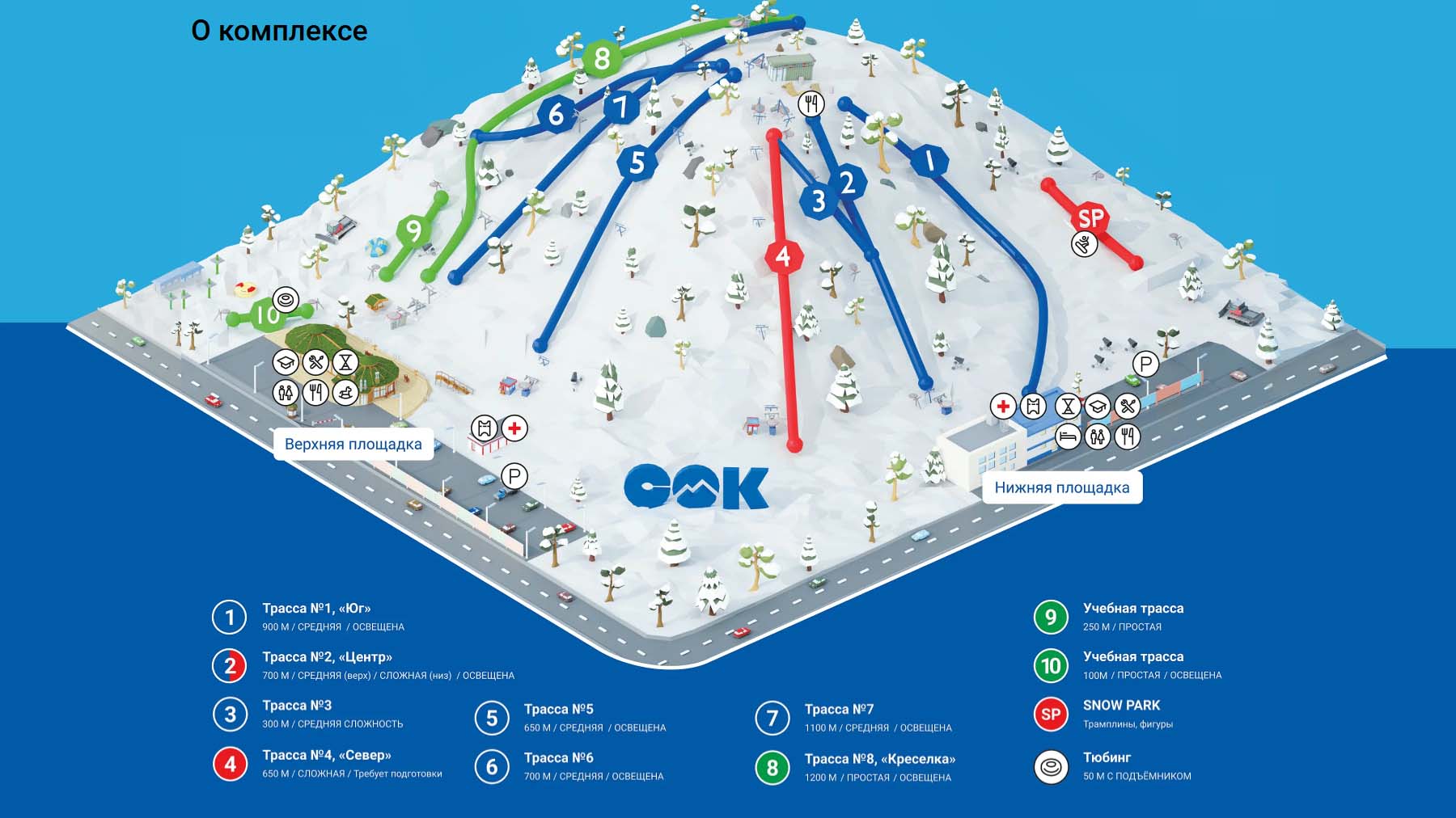 Если вы еще не профи, рекомендуем трассы № 1, 2, 8. Самая сложная трасса — №4 «Север». На учебной и детской трассах работает удобный подъемник типа беби-лифт.