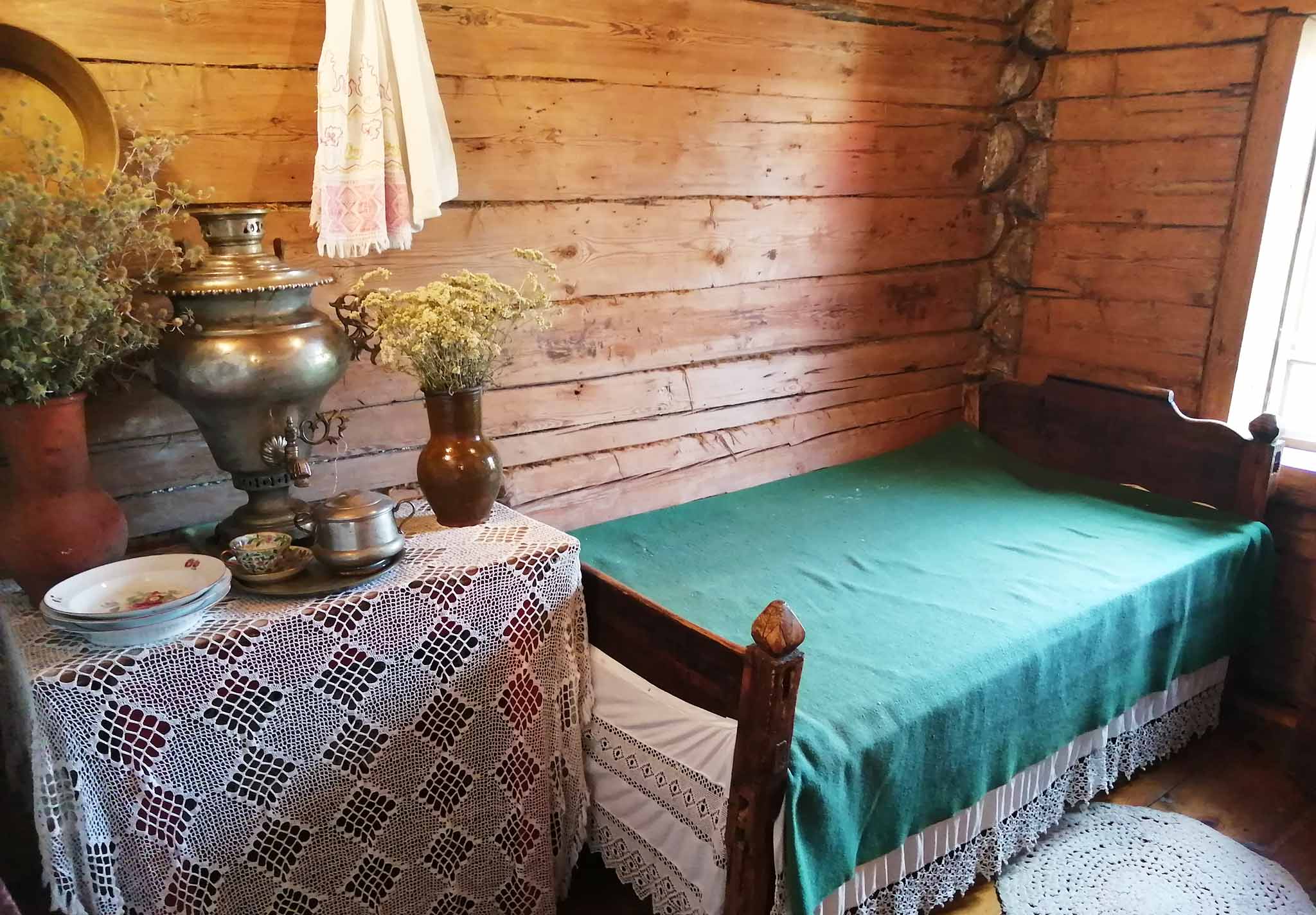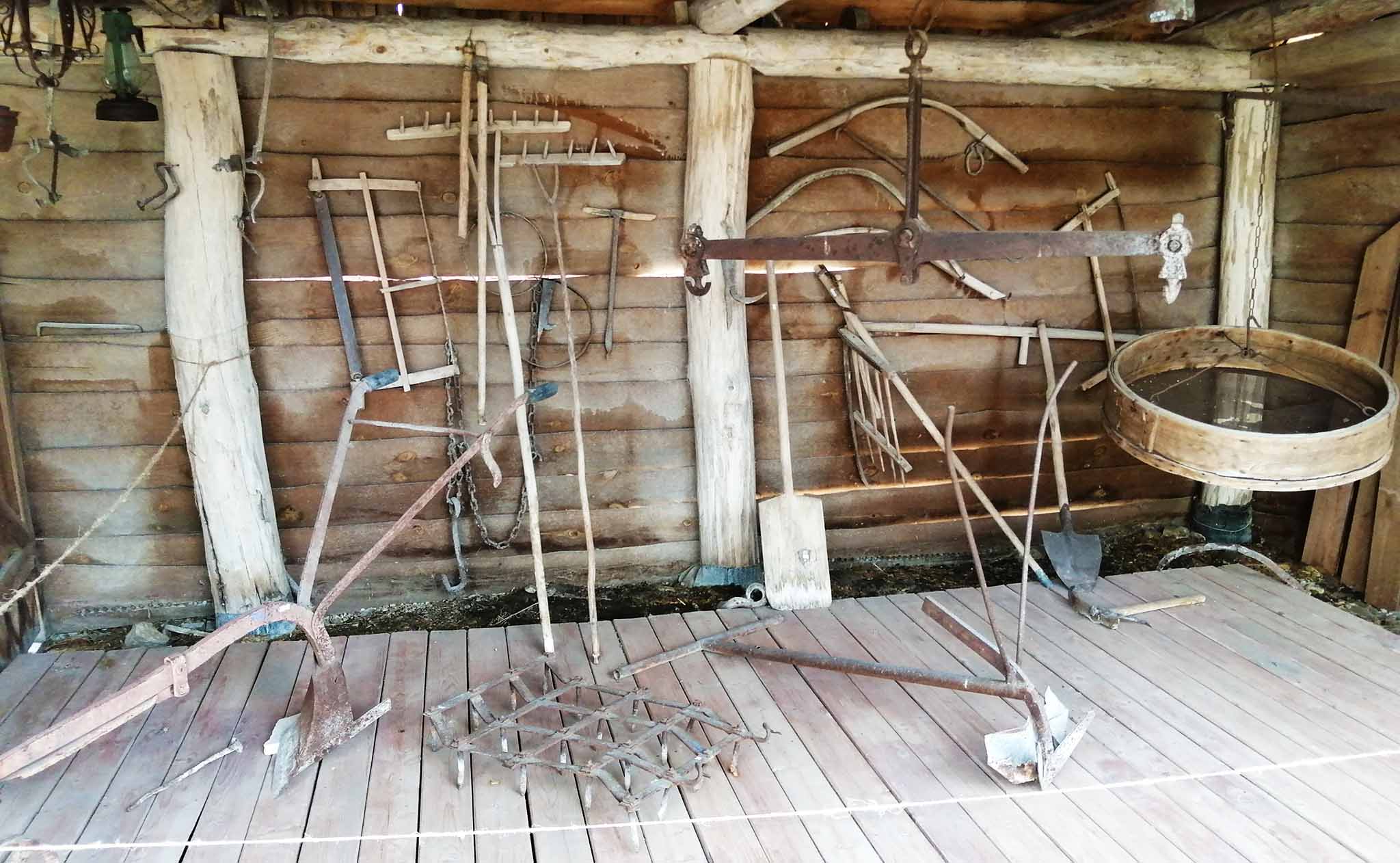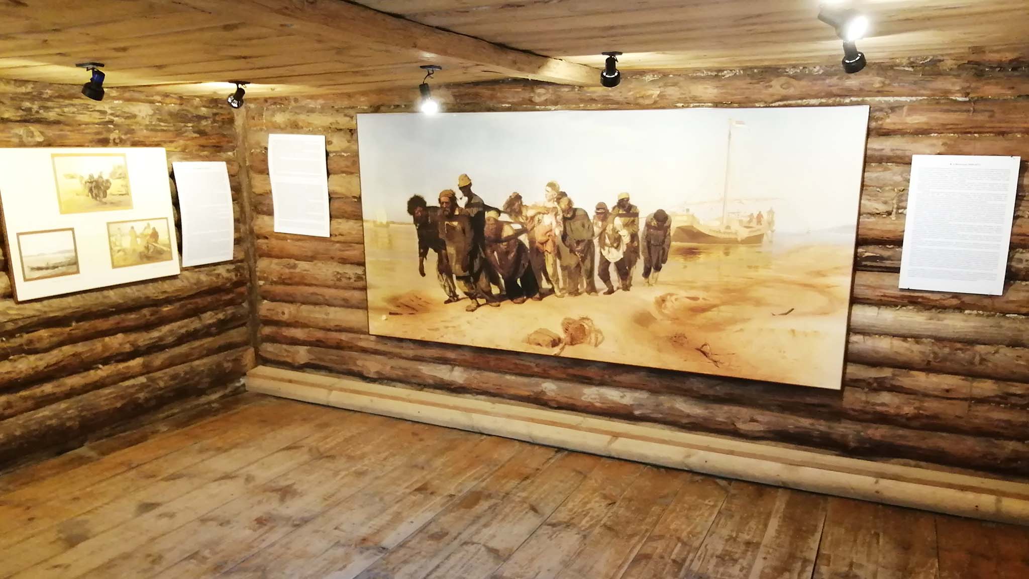Изба Алексеева окружена двором и характерными для тех времен постройками: хлевом, амбаром, сараем. Сегодня там можно увидеть орудия крестьянского труда, в одном из помещений висит копия «Бурлаков на Волге» и многочисленные эскизы, которые предшествовали написанию шедевра. Экскурсовод расскажет об истории создания картины, отношении Репина к бурлакам. Здесь же стоит небольшая скульптура — фигуры трех художников: Репина, Васильева и Макарова. В избе воссоздана примерная обстановка 1870-х. Подлинников, которыми пользовались Репин и его друзья, не сохранилось. Помогли вещи, принесенные жителями села и воспоминания самого Репина, записанные им в книге «Далекое близкое». В том числе и некоторые подробности, кто из художников где и на чем разместился в крестьянской избе.
