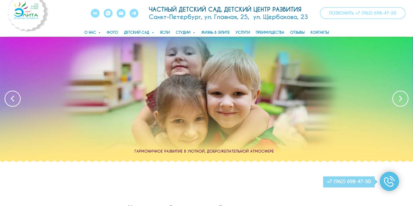Детский сад с комфортными условиями пребывания и качественным образованием. Здесь есть аквазона, площадка для прогулок и свой театр-мюзикл. Для детей проводятся учебные и развивающие занятия, работают кружки, секции и творческие студии: футбол, балет, шахматы, кулинария, плавание и другие. Организовано 5-разовое питание, проводятся экскурсии, культурные мероприятия и выставки.
