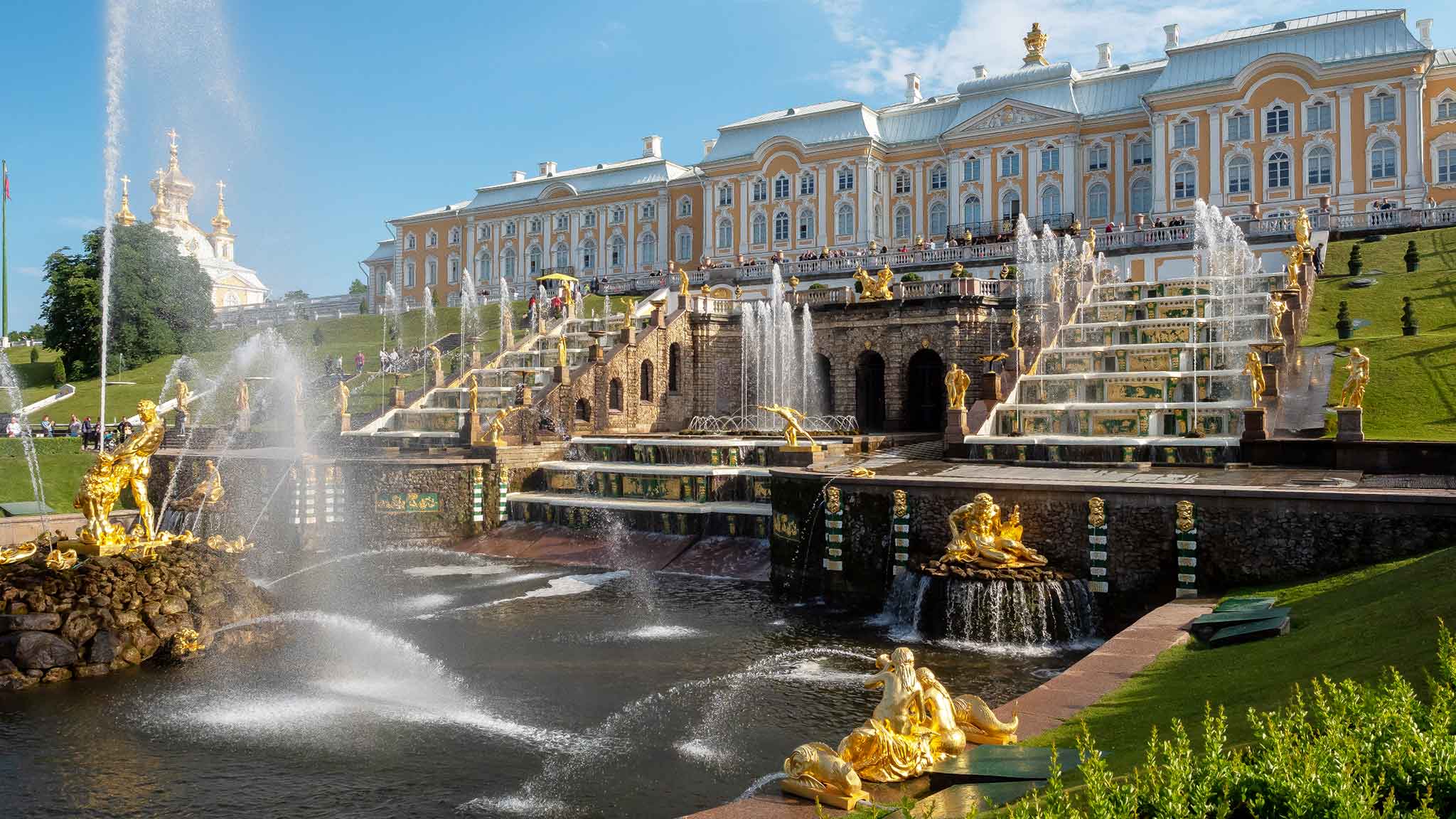 Это самый популярный пригород Санкт-Петербурга и самая настоящая «столица фонтанов». Огромный дворцово-парковый ансамбль когда-то построил для себя Петр I на берегу Финского залива. Теперь этой красотой может полюбоваться каждый. В хорошую погоду гулять по паркам Петергофа можно бесконечно — вся территория занимает порядка 120 гектаров. Обязательная программа — увидеть Большой каскад с «Самсоном, раздирающим пасть льва», фонтаны «Шахматная доска», «Львиный каскад», а для детей — фонтаны-шутихи.