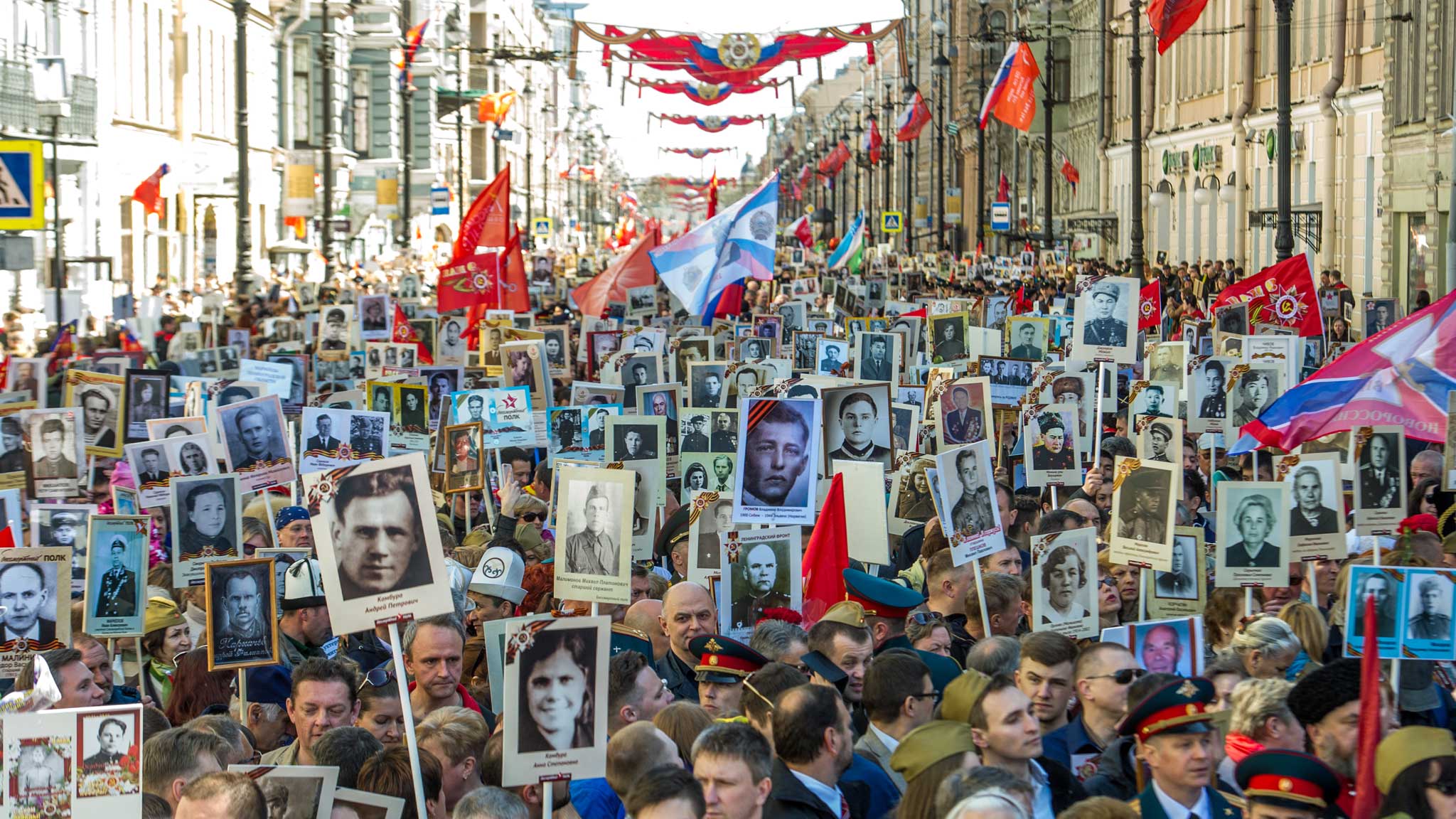 Днем в Санкт-Петербурге проходит акция «Бессмертный полк», в ней принимает участие любой желающий. Шествие стартует от Суворовского проспекта и завершается на Дворцовой площади. Весь маршрут в колонне занимает несколько часов, но к шествию можно присоединиться и по ходу движения.