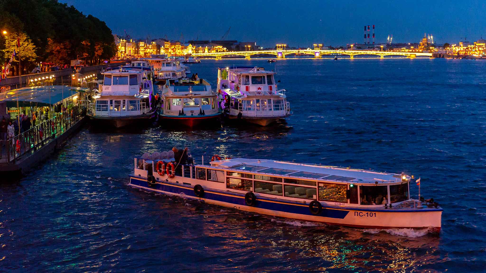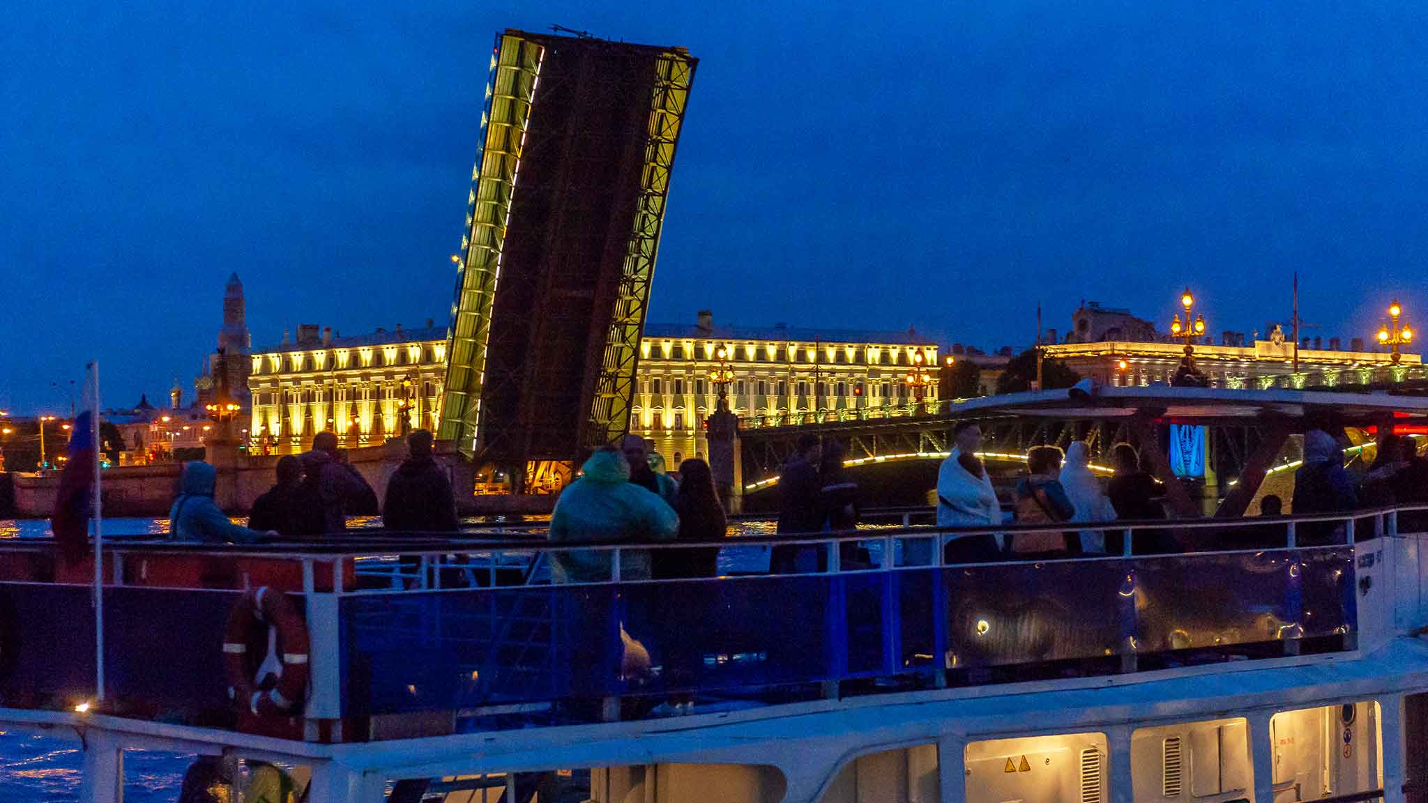 Ночные экскурсии на развод мостов в Санкт-Петербурге в 2026 году начинаются обычно после полуночи и длятся от полутора часов. Но все зависит от маршрута и программы. Классическая экскурсия включает в себя водную прогулку прямо по Неве, над которой и разводятся мосты. Есть более длинные маршруты, которые захватывают примыкающие реки и каналы. А есть экскурсии с выходом прямо в Финский залив. Можно выбрать двух- или трехпалубный теплоход со смотровой площадкой и закрытой зоной — если боитесь ветра или прохладной погоды. А в теплые ночи отличный вариант — маленькие теплоходы с открытой палубой. Попасть на экскурсию можно на любых причалах и пристанях, которыми усыпан весь центр города — на Дворцовой, Английской, Университетской, Адмиралтейской набережных, а также на набережных Мойки и Фонтанки. Оплатить поездку можно там же — стоит удовольствие от 800 рублей на человека, а детям до 5 лет обычно положен бесплатный билет.