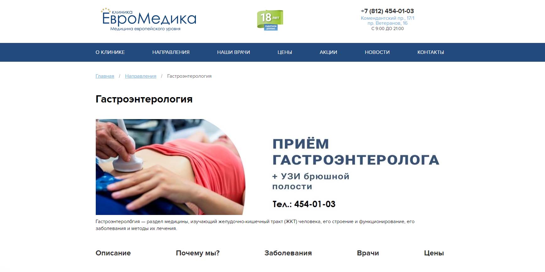 В клинике работают эксперты, который окажут помощь при проблемах ЖКТ у взрослых и детей. Проводятся все виды лабораторных исследований, УЗИ. Лечат язвенную болезнь желудка и двенадцатиперстной кишки, гастрит, перитонит, аппендицит, колит, дисбактериоз кишечника, гепатит, панкреатит и другие заболевания. На сайте организации представлены подробные и последовательные рекомендации по подготовке к приему гастроэнтеролога.