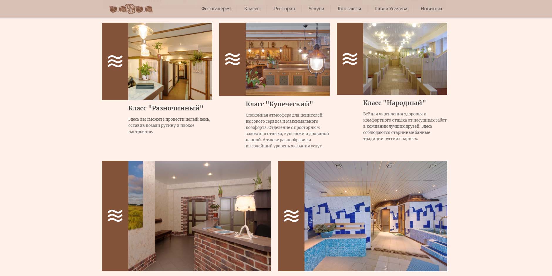 Гостей встречают несколько классов: «Купеческий», «Разночинный», «Народный», «Семейный» и «Space». Оригинальные интерьеры в совокупности со старинными банными традициями создают неповторимую атмосферу спокойствия и расслабления. Можно выбрать парную — русскую, финскую, римскую или турецкую. Есть бассейн с гидромассажем, купель-ледянка. Также предлагают разные виды массажа и оздоровительные процедуры для лица и тела.