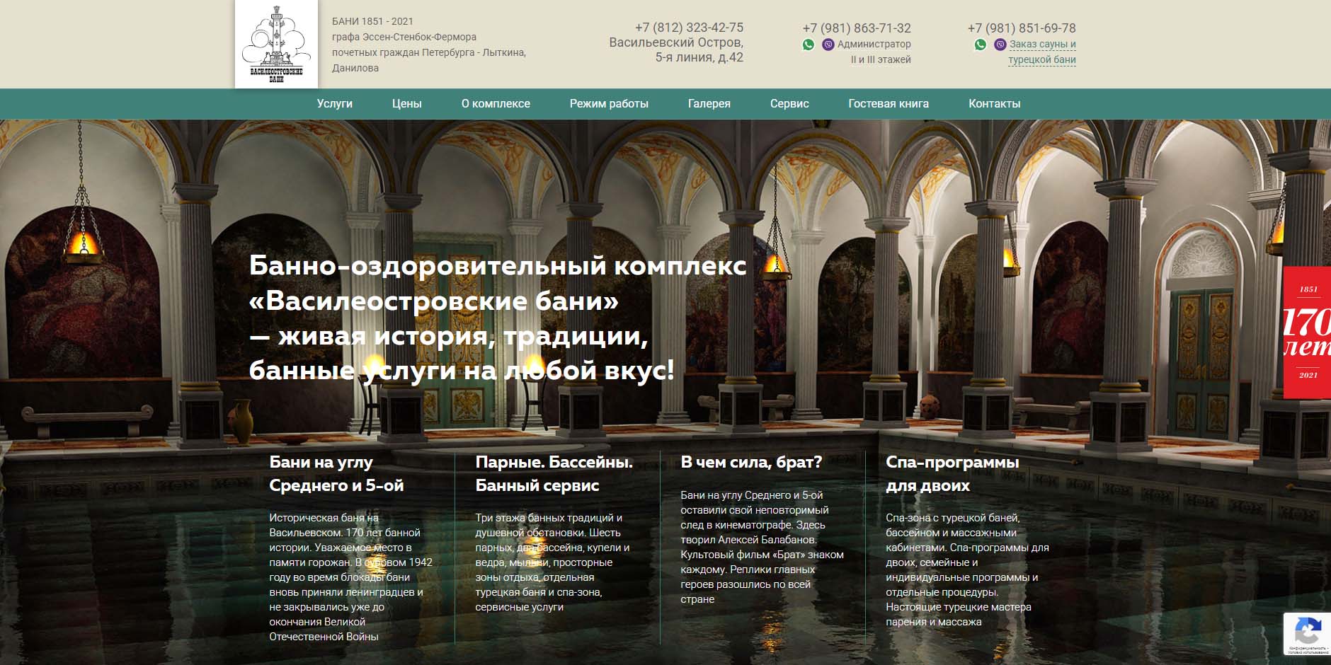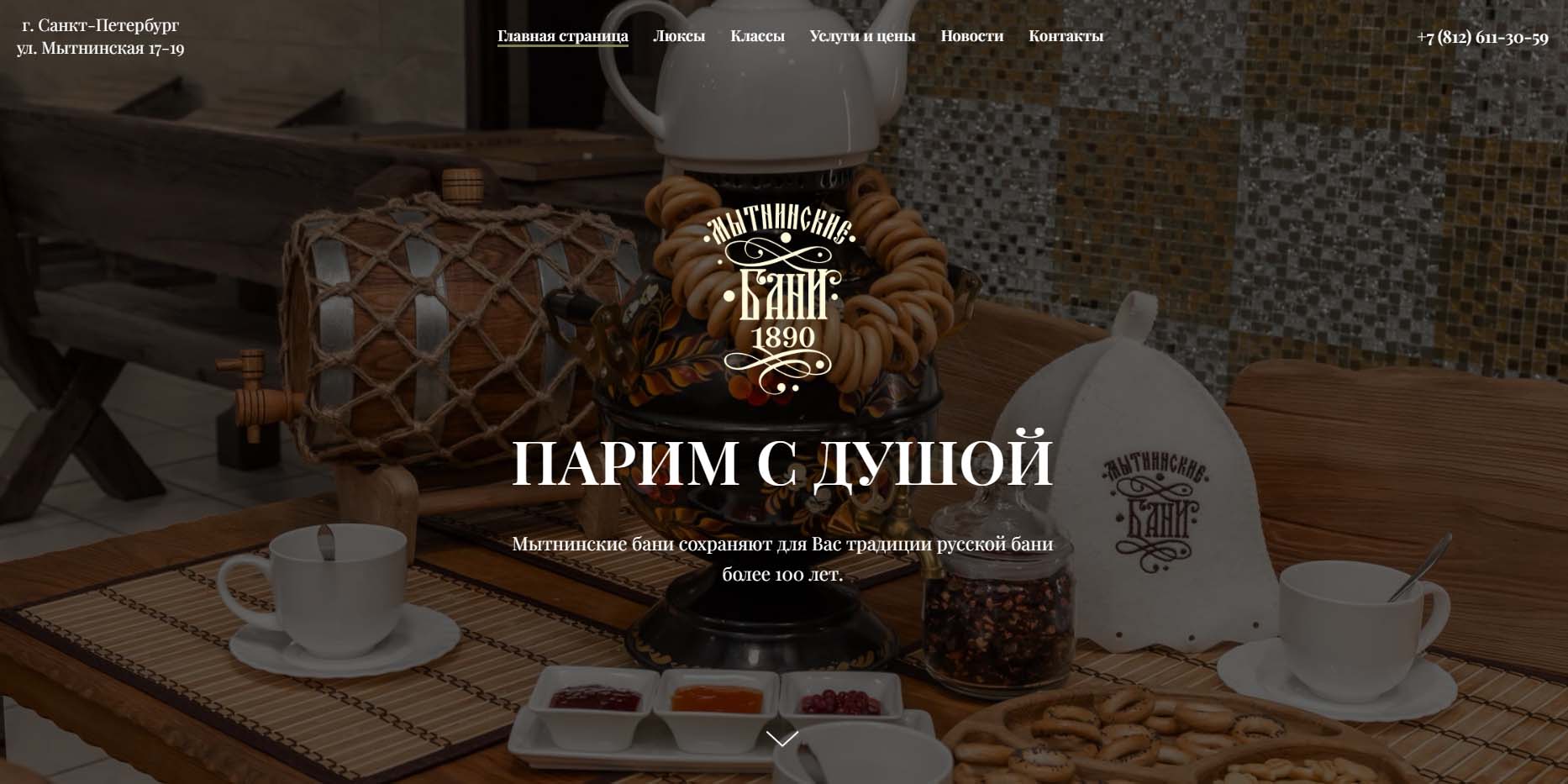 Один из старейших банных комплексов в Санкт-Петербурге — работает с 1890 года. Здесь топят исключительно березовыми дровами, которые насыщают воздух приятным ароматом, и строго соблюдают банные традиции. Однако, не отказываются и от достижений современности, предлагая услуги массажиста и косметолога. В мужских и женских классах работают дипломированные пармейстеры. В люксах (всего их 6), выполненных в разных стилях интерьера, есть сауны, парилки, выход к купели.