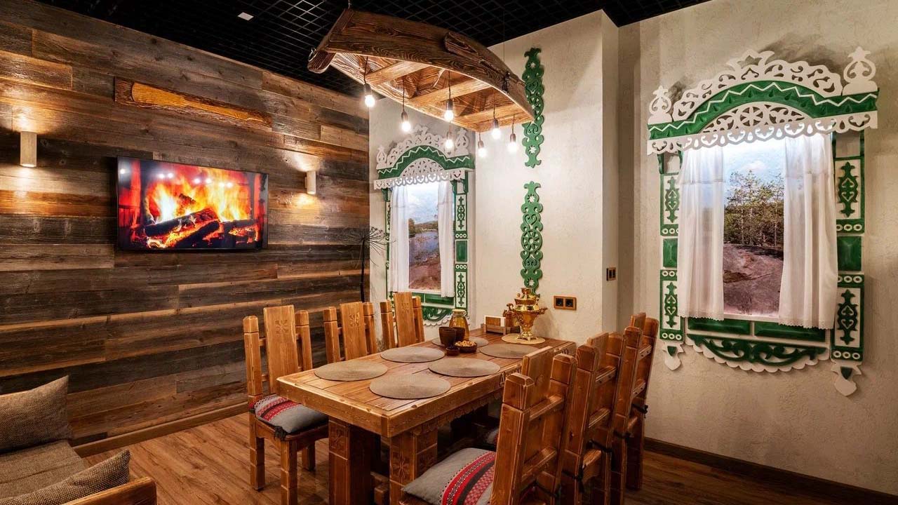 На территории банного комплекса есть уютный ресторан, где особое внимание уделяется приготовлению мяса на огне. Гостям предлагаются вкусные завтраки, обеды и возможность отметить праздник в атмосферной обстановке.